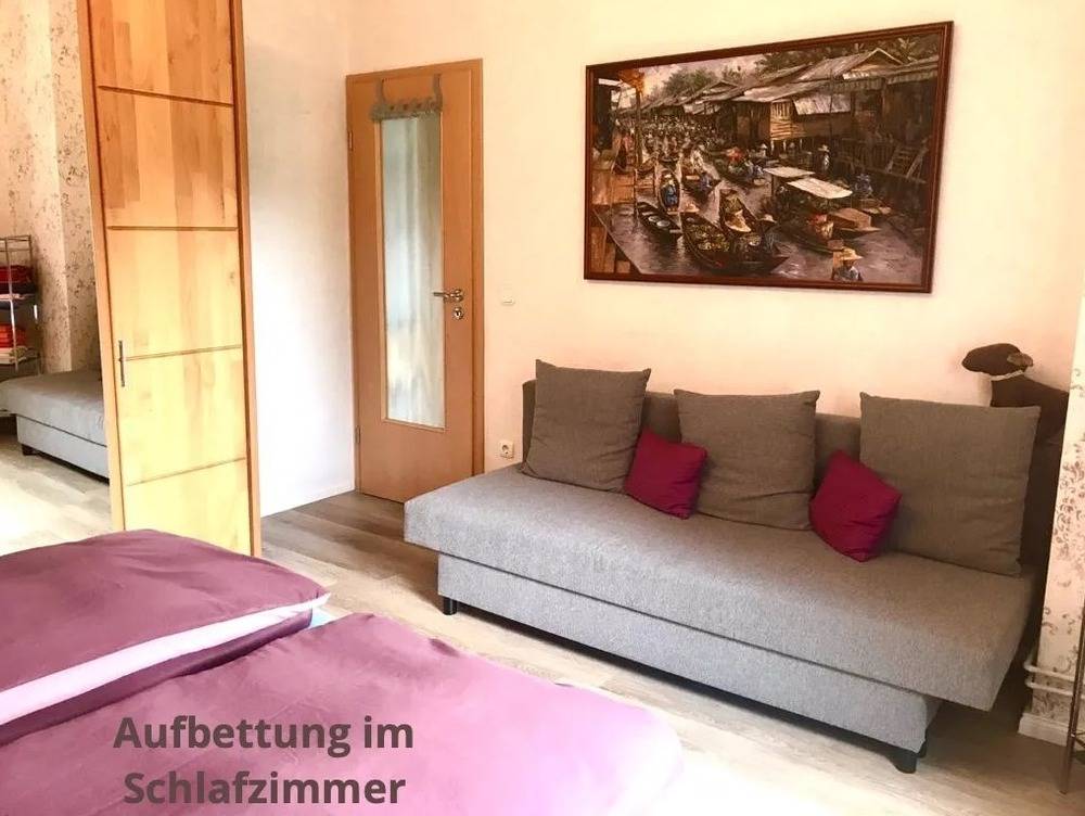 Das Schlafzimmer bietet mit Doppelbett und Schlafcouch ausreichend Platz. Von hier haben Sie eine Aussicht in den kleinen, ruhigen angrenzenden Park.