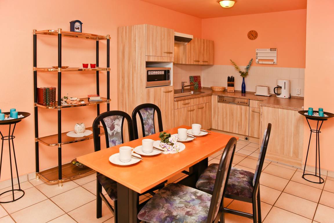 Die Ferienwohnung ist eingerichtet mit einer Küchenzeile mit Geschirrspüler, Induktionsfeld, Mikowelle.