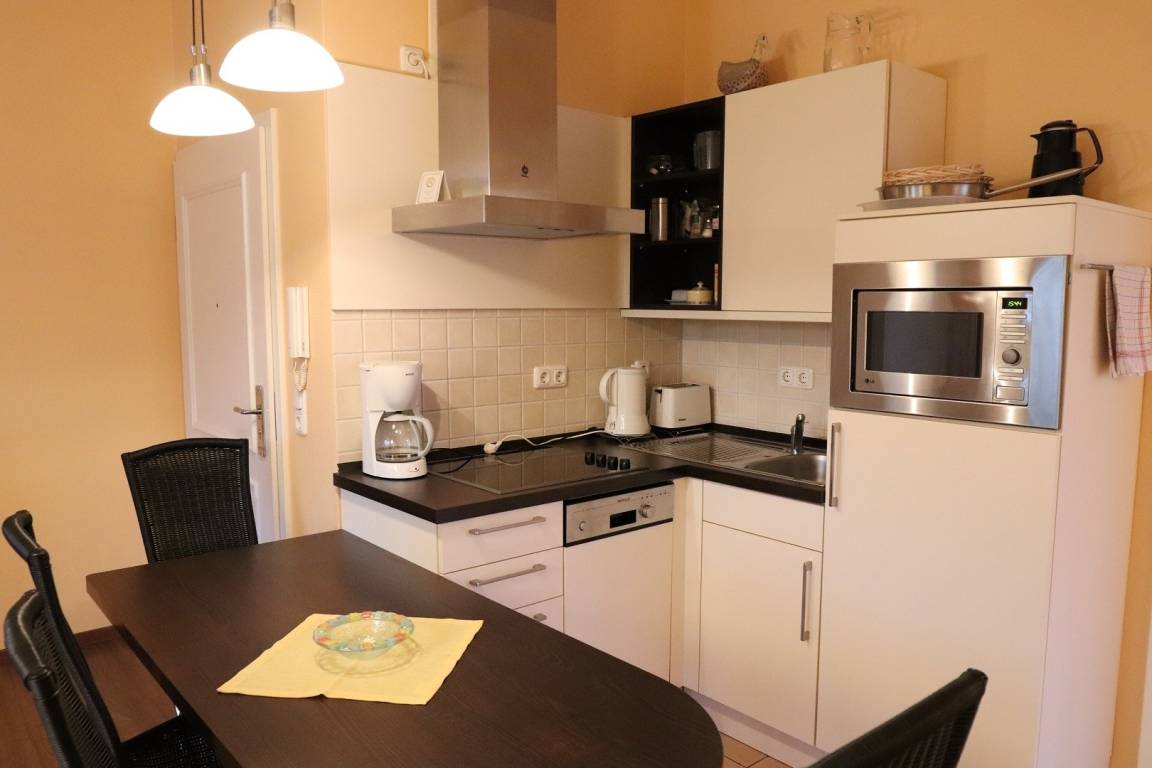 In das Wohnzimmer mit Flachbildfernseher ist die vollwertig eingerichtete Küche mit Tresen integriert. Die Küche umfasst ein Ceranfeld, Mikrowelle und Geschirrspüler.