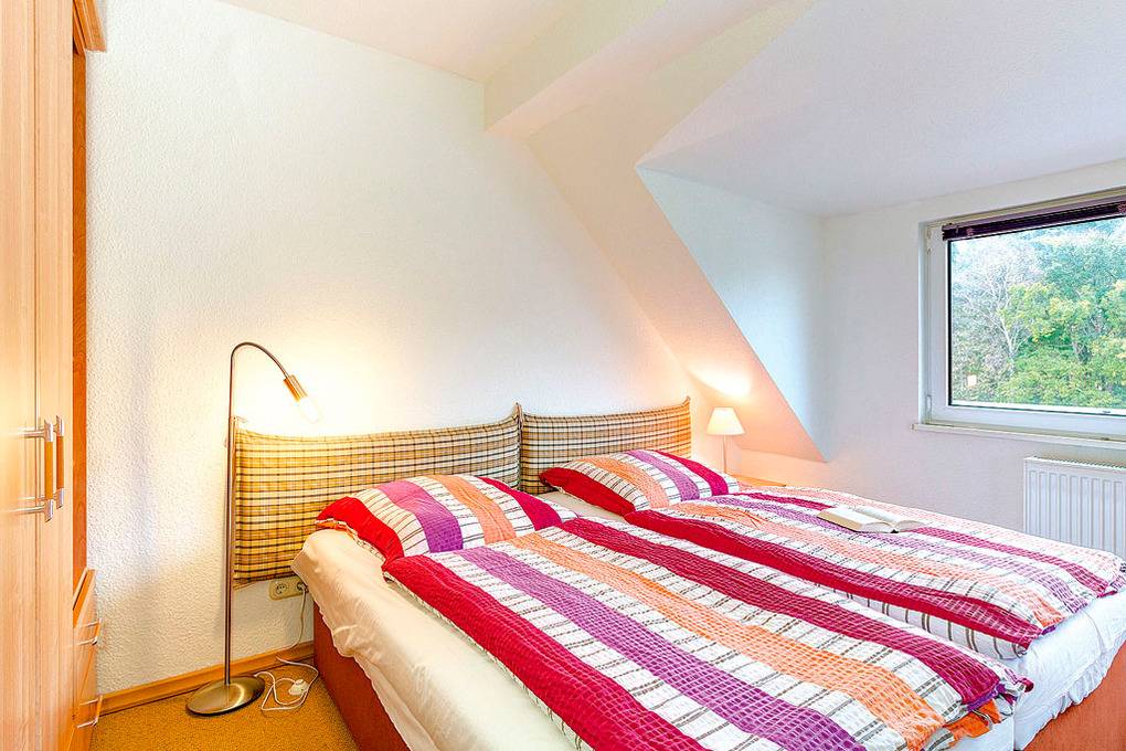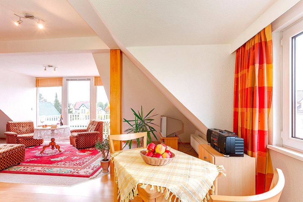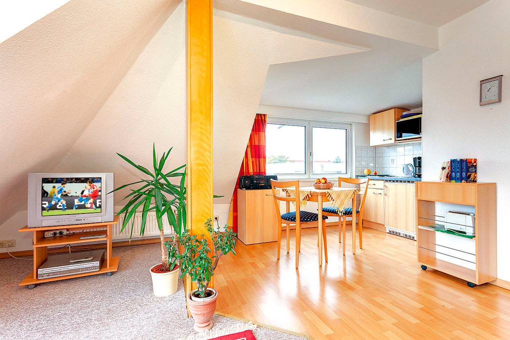 D 130.59 Wohnung 2 Pers.: 2-Zimmerwohnung mit 55 qm Wohnfläche, 2. Etage. Heller, lichtdurchfluteter Wohn-/Essraum mit Couchgarnitur, Sat-TV, Esstisch, Küchenblock (2 Pl. E-Herd, Mikrowelle). Doppelzimmer mit Sat-TV. Bad: Du, Wb. Separates WC.