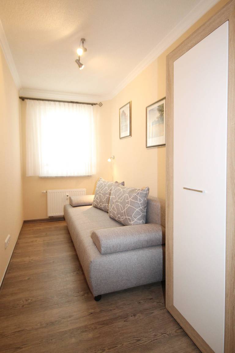 Das zweite Schlafzimmer ist mit einer modernen ausziehbaren Schlafcouch (1,40 m Liegebreite) und einem zusätzlichen Kleiderschrank für weitere Urlaubsgarderobe ausgestattet.