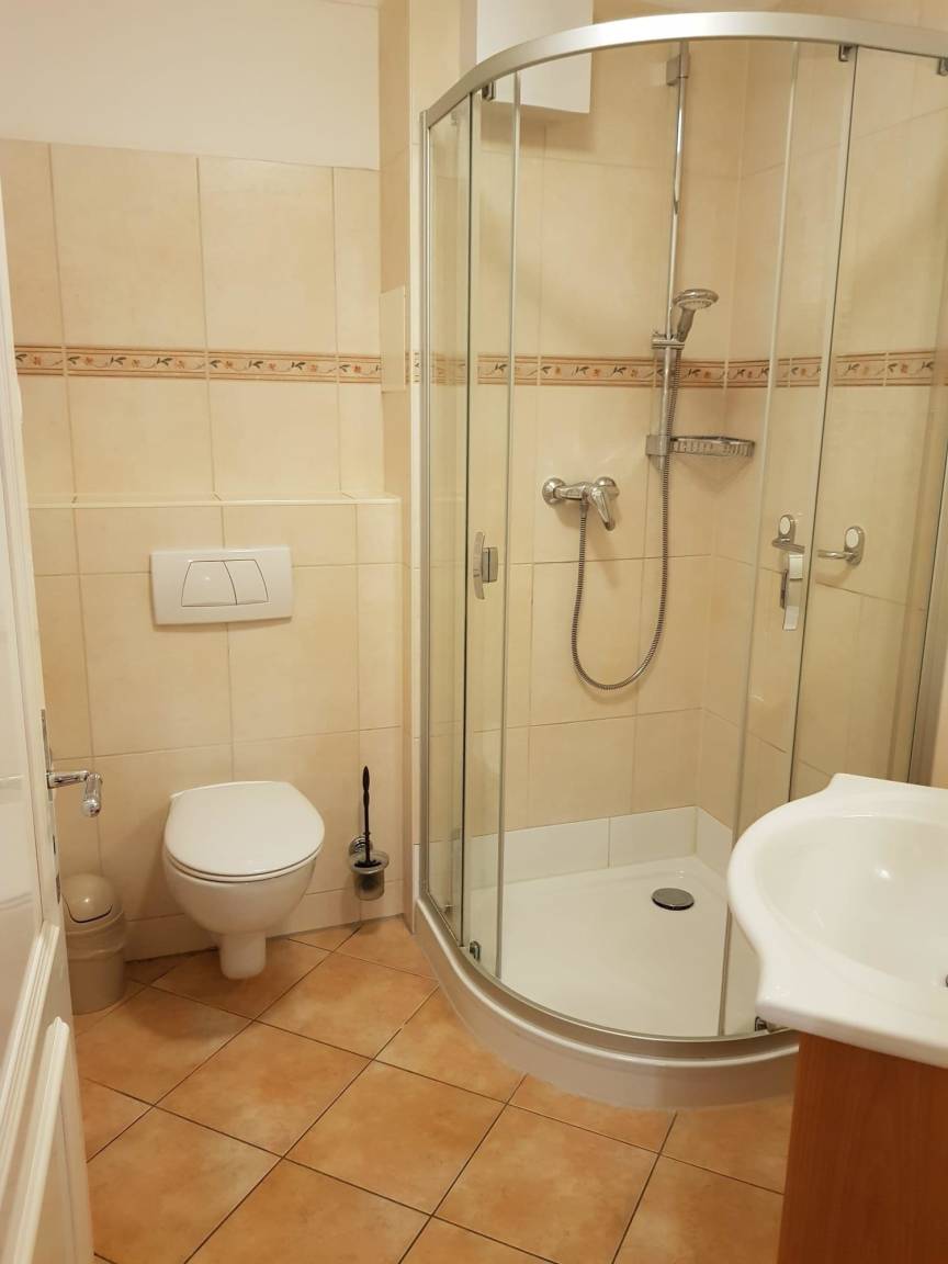 Im hell gefliesten Badezimmer mit einer Dusche, einem WC, einem Waschbecken mit Unterschrank sowie einem Handtuchheizkörper befinden sich neben genügend Ablageflächen für Ihre Kosmetikartikel ebenso ein Haartrockner und auch ein Kosmetikspiegel.