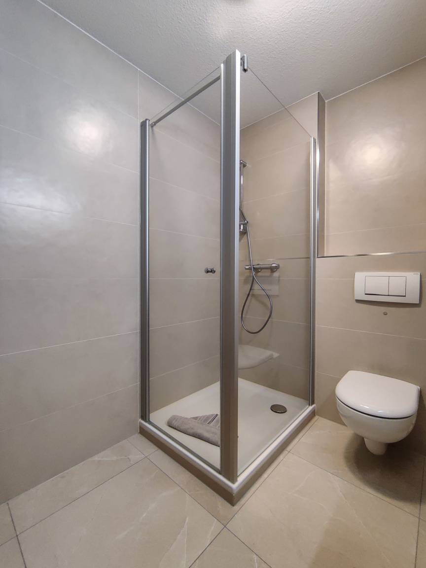 Das Badezimmer verfügt über eine Dusche, WC sowie einem Waschbereich mit beleuchteten Spiegel. Eine Unterbringungsmöglichkeit für Ihr Hygiene-bzw. Kosmetikartikel steht Ihnen außerdem zur Verfügung