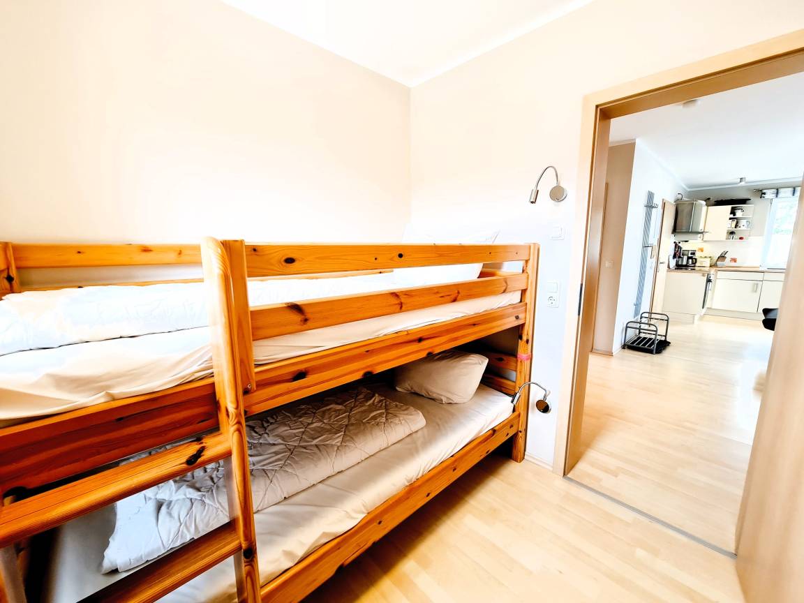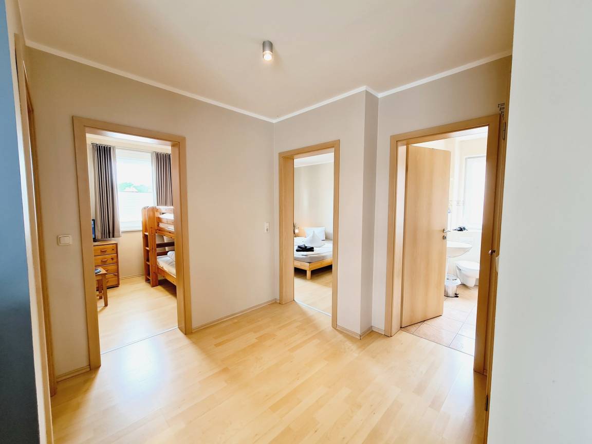 Die Wohnung verfügt über 3 Schlafzimmer (1 SZ mit Etagenbett), zudem einen großzügigen Wohn-, Koch- und Essbereich, einem Bad mit Dusche, einem Gäste-WC mit Waschmaschine und einem großzügigen Balkon zur Südseite.