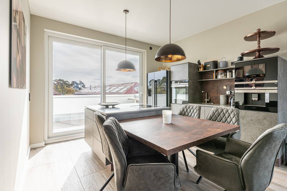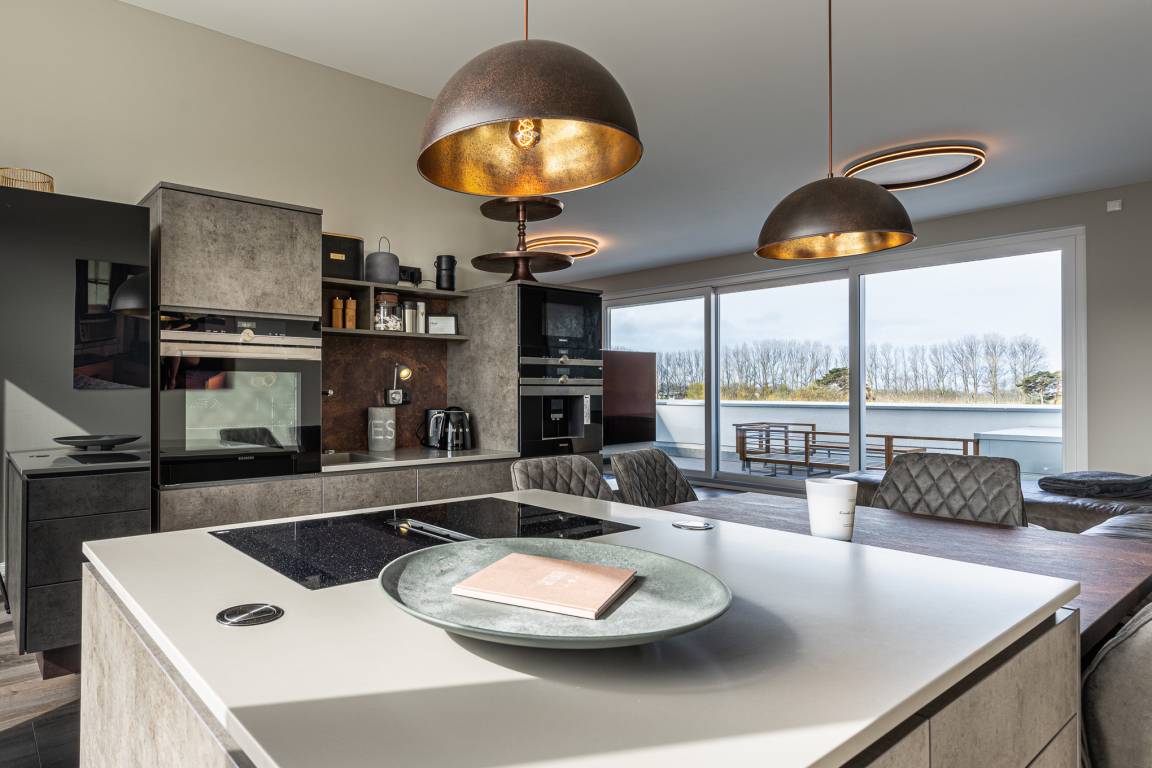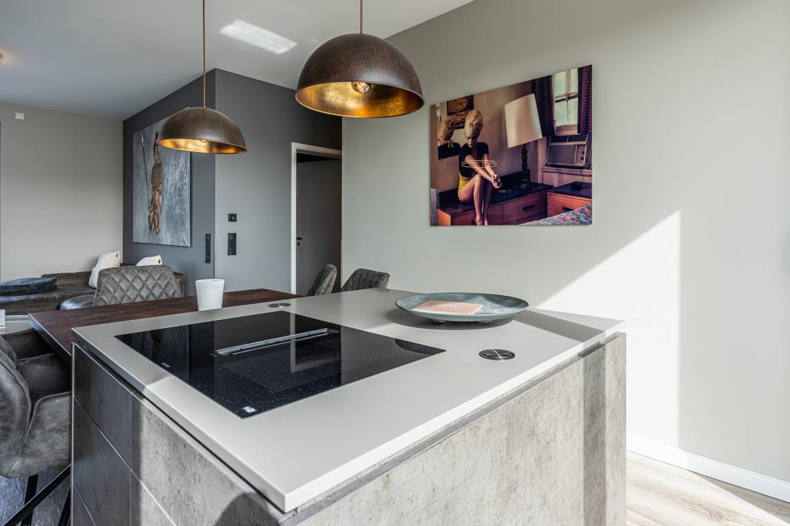 An den geschmackvollen Wohnbereich grenzt eine vollausgestattete, hochwertige Küche mit Kochinsel: Annehmlichkeiten wie ein hochgebauter Backofen, Geschirrspüler und Mikrowelle lassen während Ihres Aufenthaltes keine Wünsche offen. Weitere Ausstattungsmerkmale wie ein großer Kühlschrank + Gefrierschrank mit Eiswürfelbereiter, Induktions-Kochfeld, Kaffeevollautomat (ganze Bohnen), Wasserkocher und Toaster runden die Einrichtung ab.