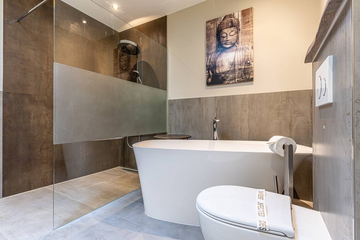 Das moderne Badezimmer (Tageslichtbad) ist nebst ebenerdiger Regendusche mit einer freistehenden Wanne und einem großen Waschtisch mit genügend Ablagemöglichkeiten für Ihre Kosmetikartikel ausgestattet. Ferner steht Ihnen hier ein kombinierter Waschtrockner zur Verfügung.