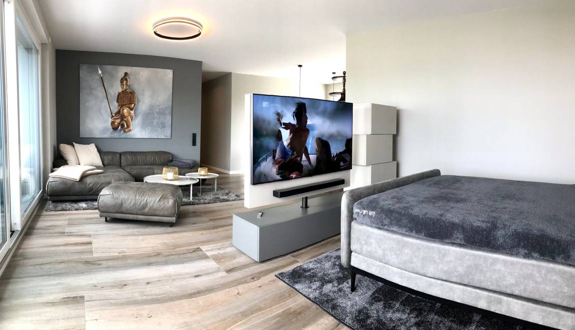 Der großzügige, kombinierte Wohnbereich bietet Ihnen viel Platz, ein bequemes Sofa zum Entspannen und sorgt mit Smart-TV und Bose-Soundsystem für genügend Entertainment während Ihres Aufenthaltes. Das Mobiliar ist in diesem Raum so integriert, dass ein zweiter Schlafbereich mit einem gemütlichen Doppeltbett (1,60x2,00m durchgängiger Topper) geschaffen wurde.