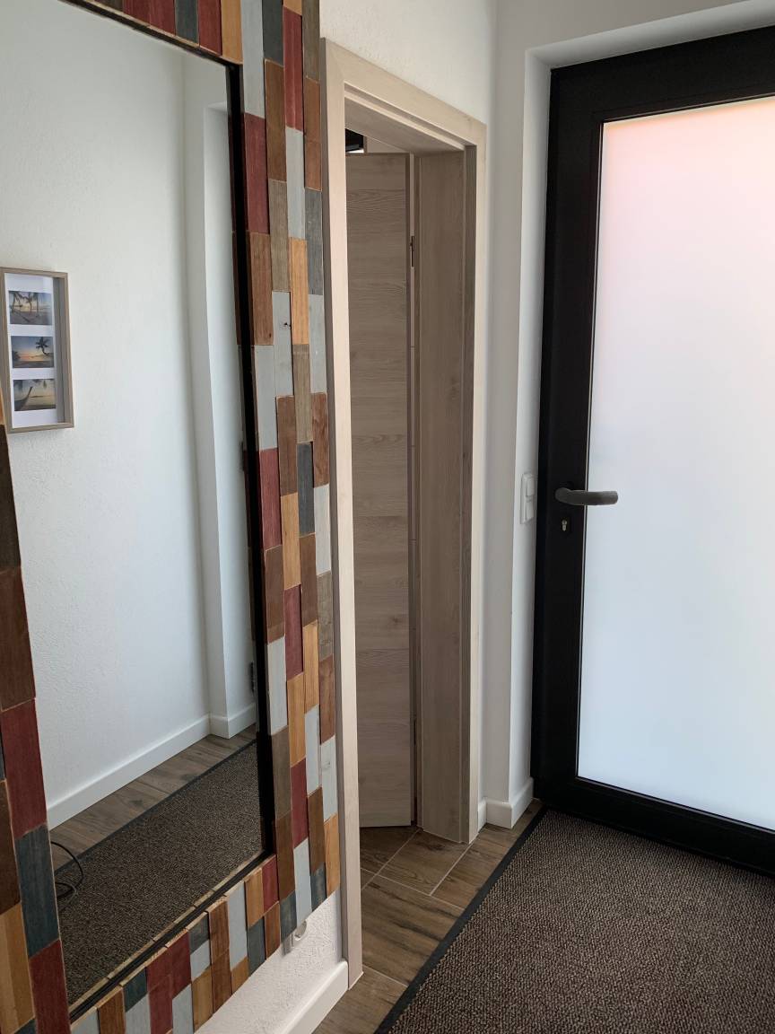 Sie parken am Haus( bis zur Wohnung gehen Sie über eine kleine Treppe ca. 25 Meter bis zur Haustür). Die Wohnung hat aufgrund der Lage über 2 Ebenen ohne weitere Etage darüber eher den Charakter einer Doppelhaushälfte. In diesem Gebäudeteil gibt es nur noch die benachbarte 2. Ferienwohnung mit eigenem Eingang.