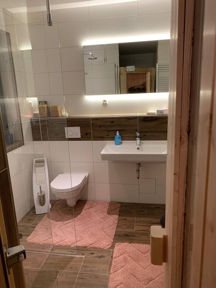 Hier befindet sich außerdem ein weiteres Bad mit ebenerdiger Dusche und Sauna( 2-3 Personen). Sie können nach dem Saunagang auf der anliegenden Terrasse an der frischen Luft entspannen.