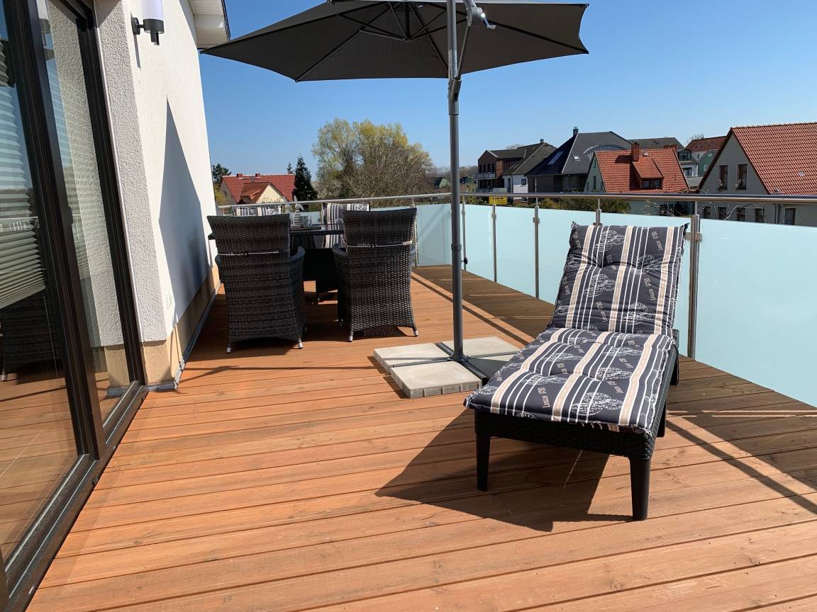 Die Wohnung begrüßt Sie mit viel Licht, Holz und einer sehr großen, ebenfalls mit Holz ausgelegten Terrasse.