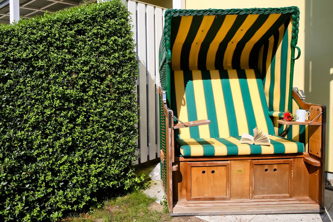 Die Ferienwohnung besitzt eine ca. 10 qm große Terrasse (Südlage!). Zugänglich vom Wohnzimmer und dem Schlafzimmer 2. Hier finden Sie eine gemütliche Sitzgarnitur und einen eigenen Strandkorb zum Verweilen. Mit einem Springbrunnen wird das Ambiente abgerundet.