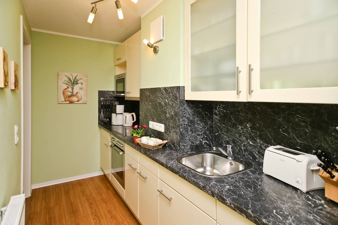 Die Küchenzeile ist ausgestattet mit einem Ceranherd mit Backofen, Geschirrspüler und Mikrowelle.