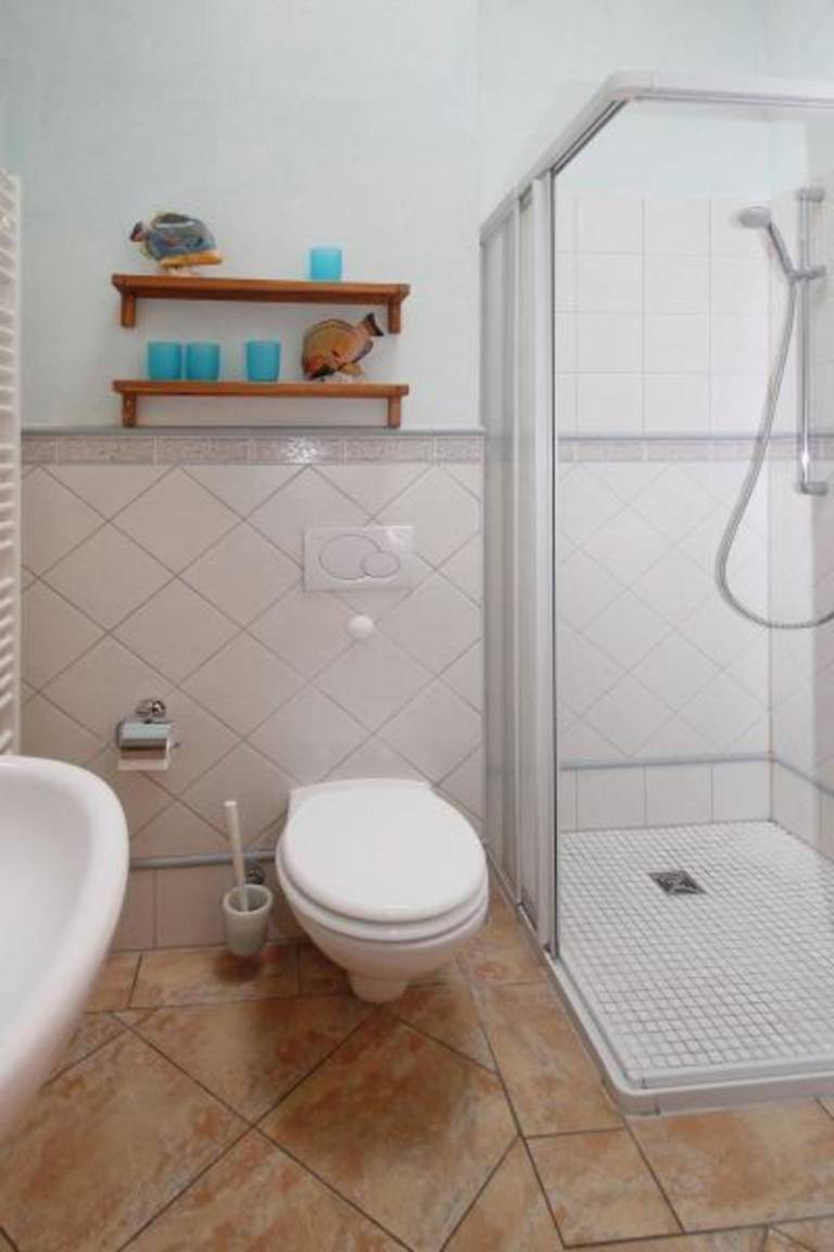 Im hellen Tageslicht-Bad mit WC, Waschbecken und Dusche befindet sich ferner ein Föhn, ein Handtuchheizkörper und für ein wohliges Gefühl eine Fußbodenheizung.