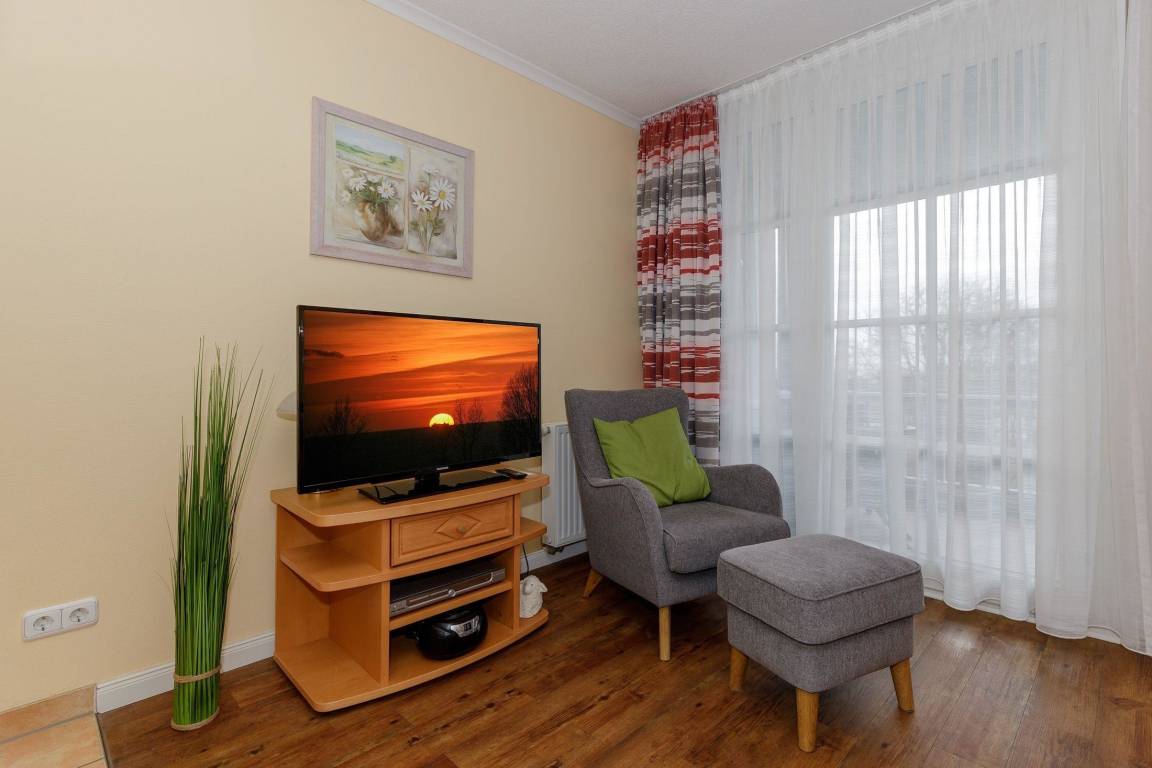Der Wohnbereich ist mit einer großzügigen Eck-Couch ausgestattet, die sich problemlos zu einem Schlafplatz für die 3te und 4te Person verwandeln lässt. Ein Flachbildfernseher mit HiFi- Anlage und ein DVD-Player stehen für Sie bereit. Der gemütliche Ohrensessel mit Hocker lädt zum Entspannen oder zum Lesen ein.