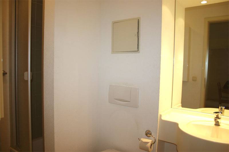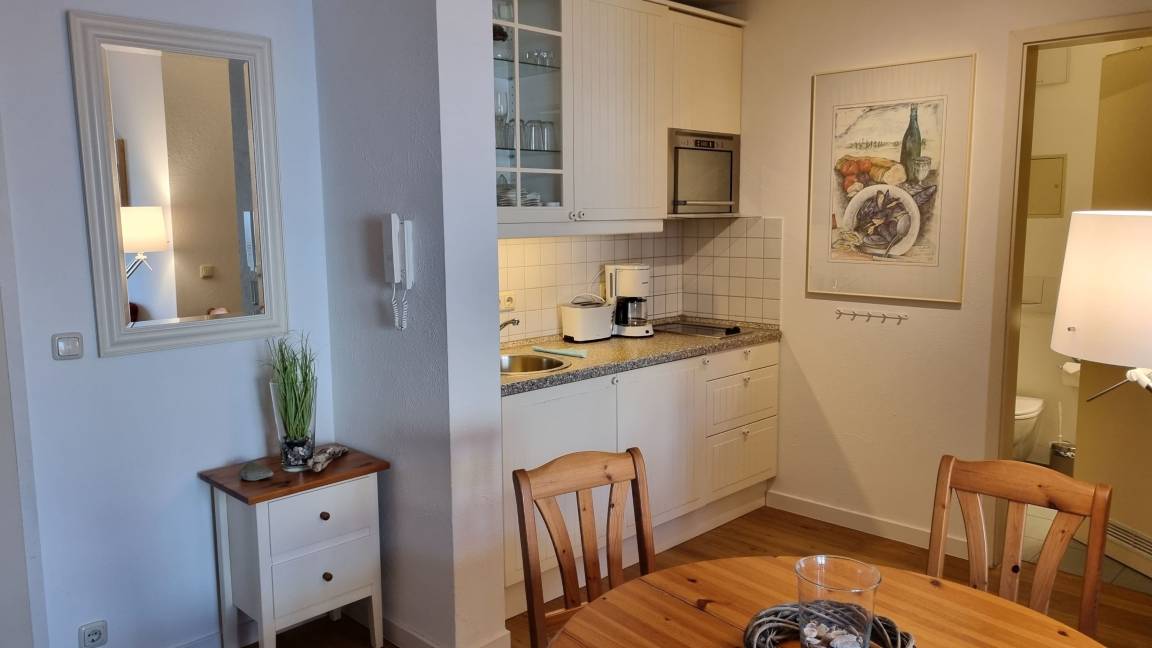Der Wohnbereich ist eingerichtet mit einer Doppelschlafcouch, Esstisch und Telefon. Im Flurbereich ist eine Pantryküche integriert. Ein Bad/WC mit Dusche ergänzt die Ferienwohnung.