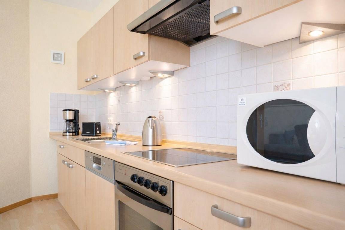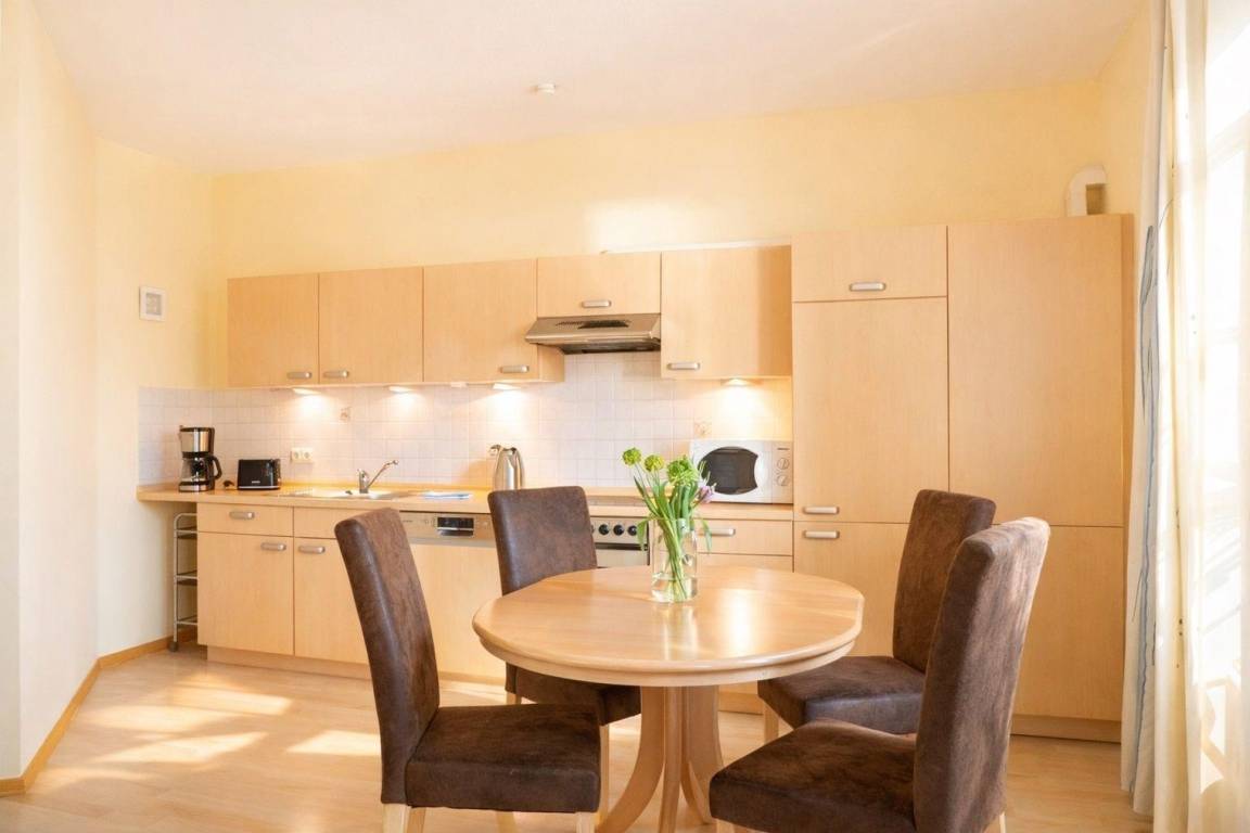 An das Wohnzimmer grenzt die offene und voll ausgestattete Einbauküche mit ausziehbarem Esstisch. Hier findet die ganze Familie Platz für gemeinsame Mahlzeiten oder auch diverse Spielestunden.