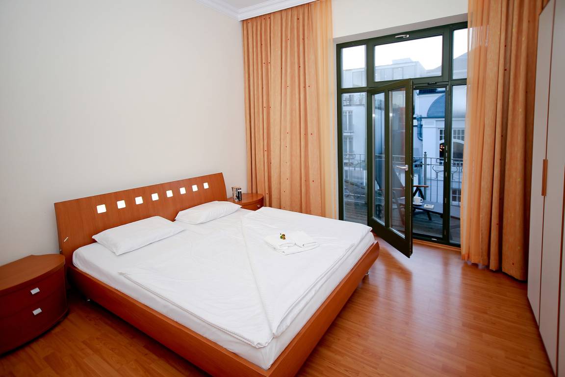 Die Wohnung liegt im 1.OG des Hauses mit einer Loggia sowie einem Balkon zur Nordseite und einem Balkon zur Westseite. Sie bietet für 4 Personen ein Schlafzimmer mit Doppelbett und ein Schlafzimmer (durch einen Raumteiler vom Wohnbereich getrennt) mit Einzelbett sowie einem Schlafsessel.