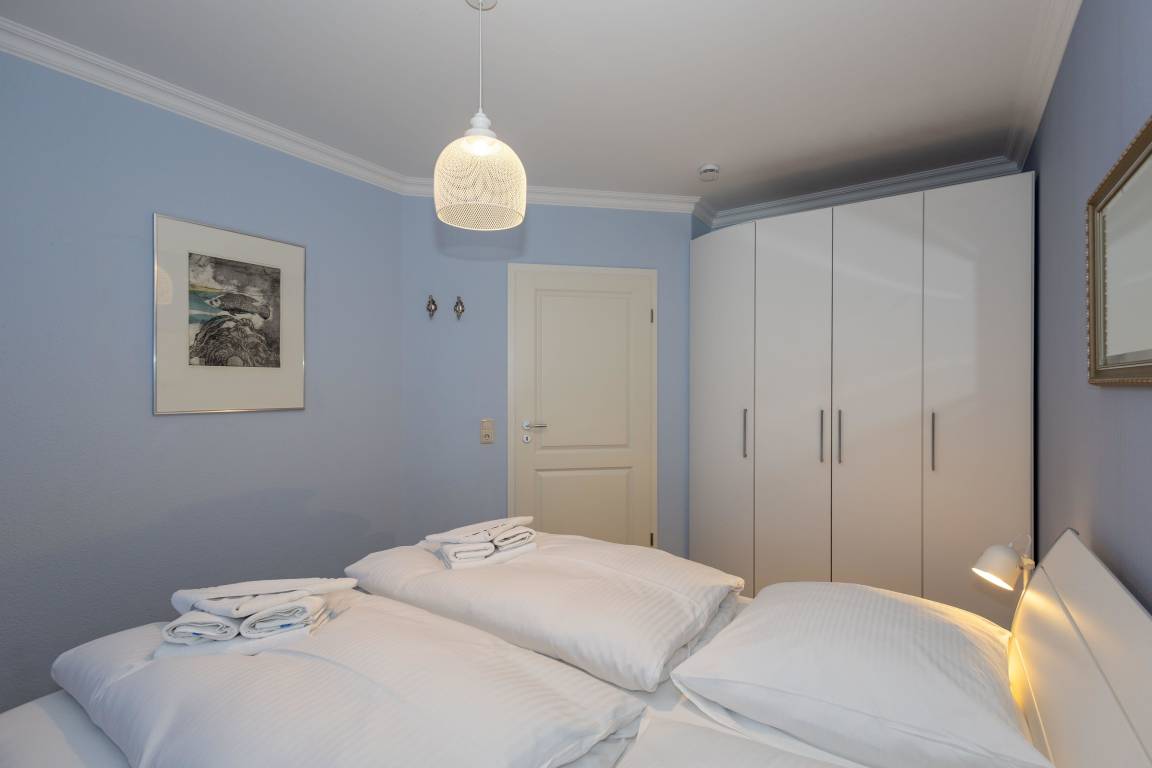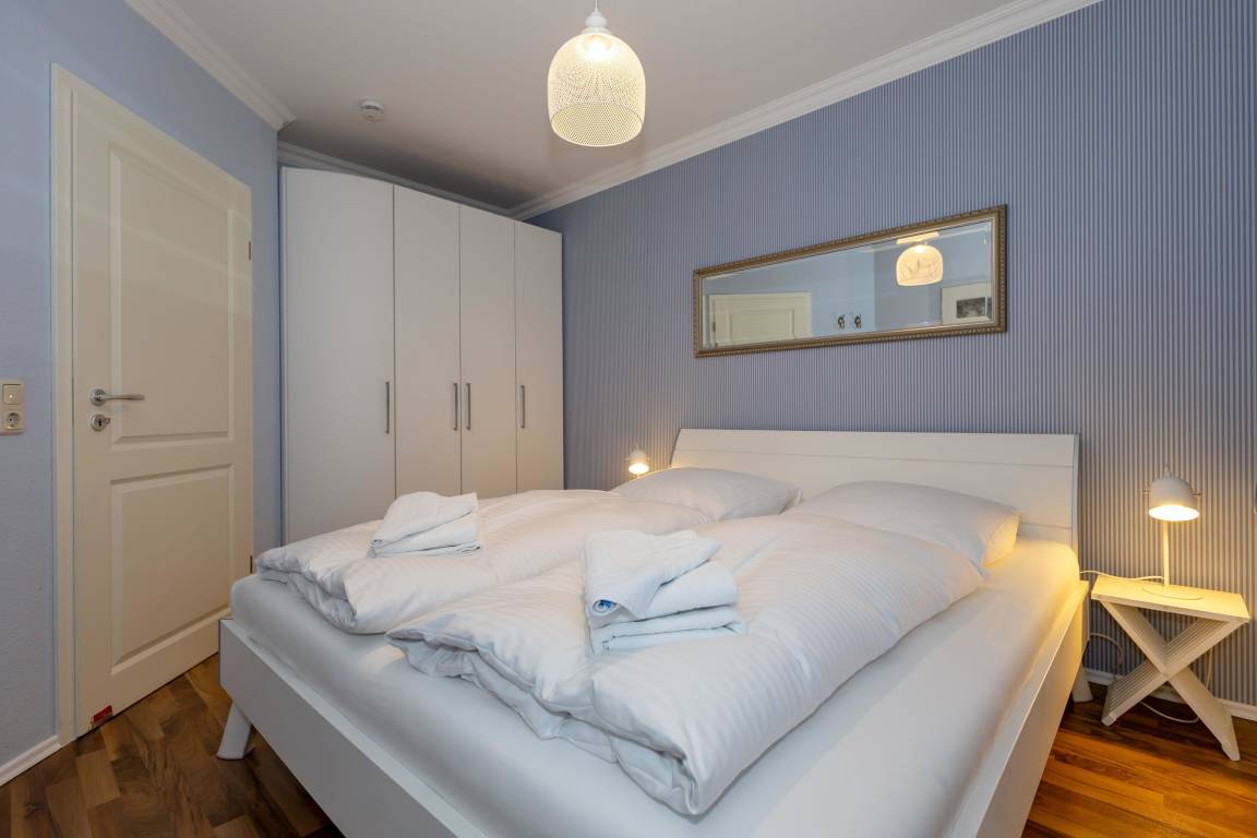 Der maritime Charme des Schlafzimmers mit dem bequemen Doppelbett und geräumigem Kleiderschrank garantiert einen erholsamen Schlaf, so können Sie voller Tatendrang in einen neuen ereignisreichen Urlaubstag starten.