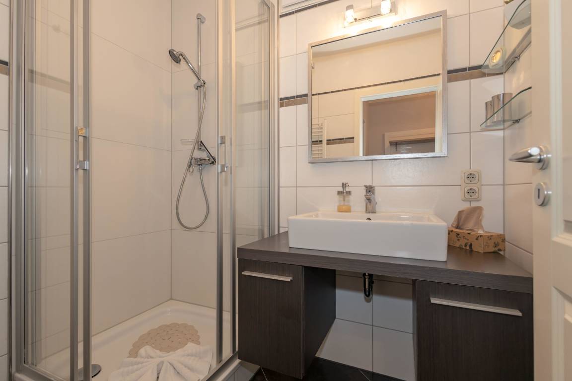 Das stilvolle Bad verfügt über eine Dusche, Designer-Waschtisch, Föhn und Fußbodenheizung.