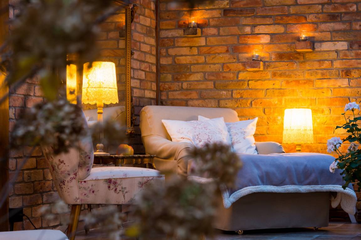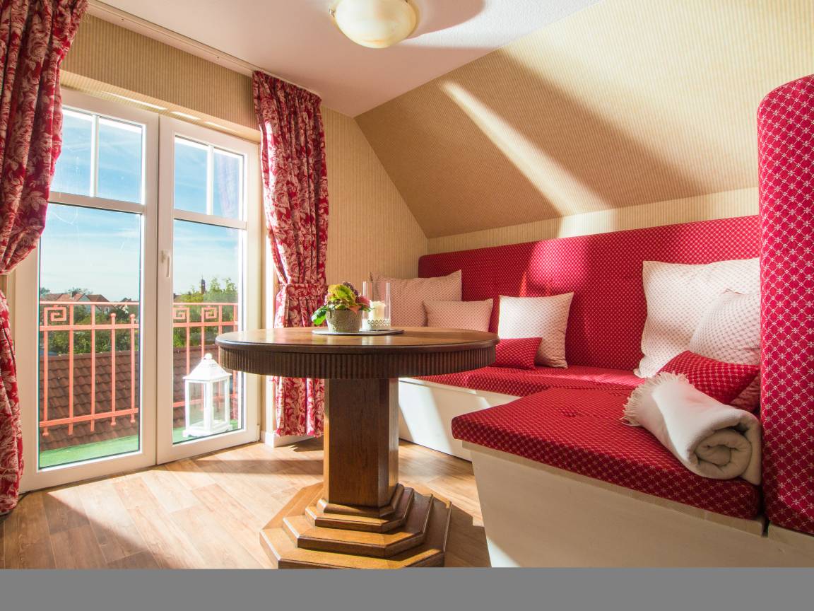 Der liebevoll gestaltete Wohnbereich mit Küchentheke, schöner Sitzecke und TV hat einen schönen Ausblick in den Hofgarten, von welchem Sie den Sonnenuntergang genießen können.