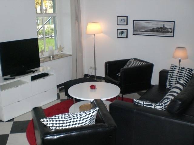Der Wohnbereich ist mit einem Esstisch und einer Sitzgruppe ausgestattet. Zur modernen Einrichtung gehört ein Farb-TV und Stereoanlage dazu.