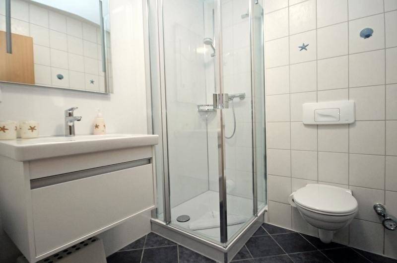 Das Badezimmer verfügt über eine Dusche, ein WC, einen Handtuchheizkörper und ein Waschbecken mit Unterschrank für Ihre Badutensilien. Ein Föhn ist ebenfalls vorhanden.