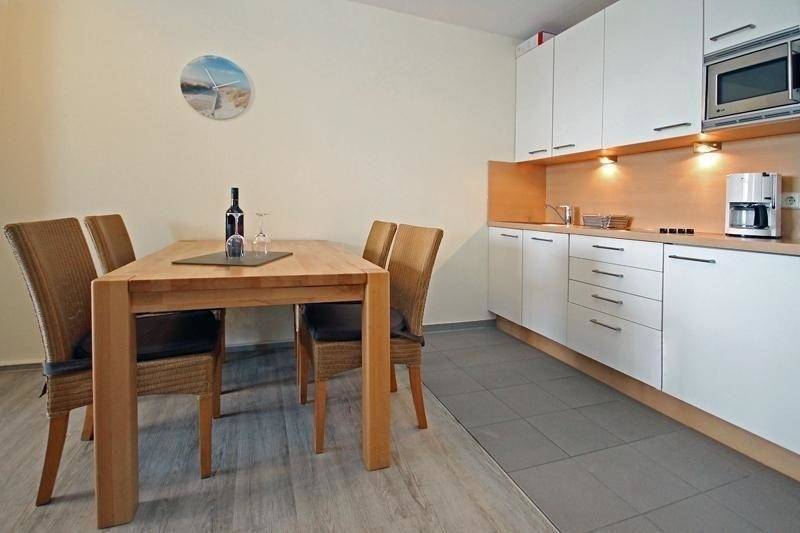 Der gemütliche Essbereich grenzt an die Küchenzeile, die voll ausgestattet ist.