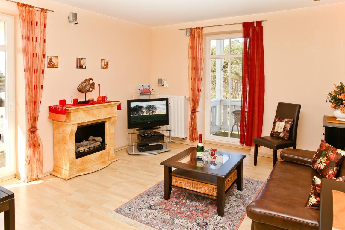 Der Wohnbereich ist mit einem Esstisch und einer Sitzgruppe mit Doppelschlafcouch ausgestattet. Zur modernen Einrichtung gehört Farb-TV mit DVD-Player sowie eine Stereoanlage dazu.