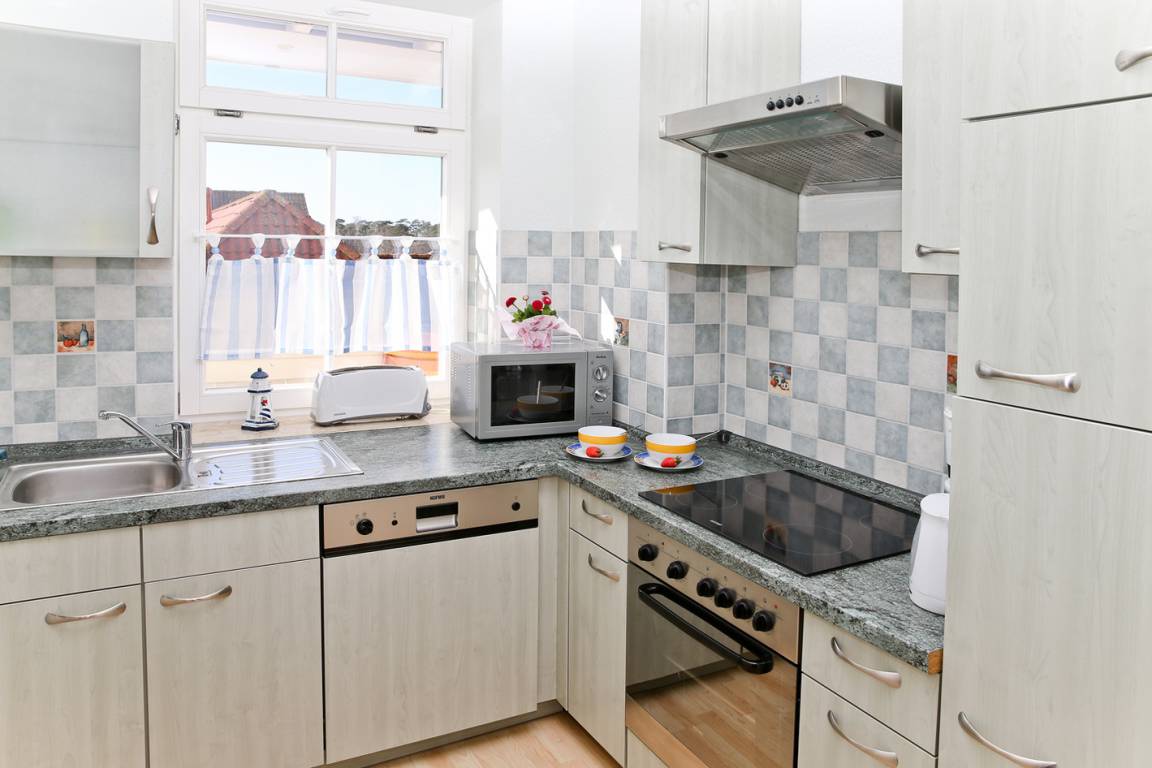 Die vollausgestattete, separate Einbauküche verfügt unter anderem über einen Geschirrspüler, Mikrowelle, Backofen und Ceranherd.