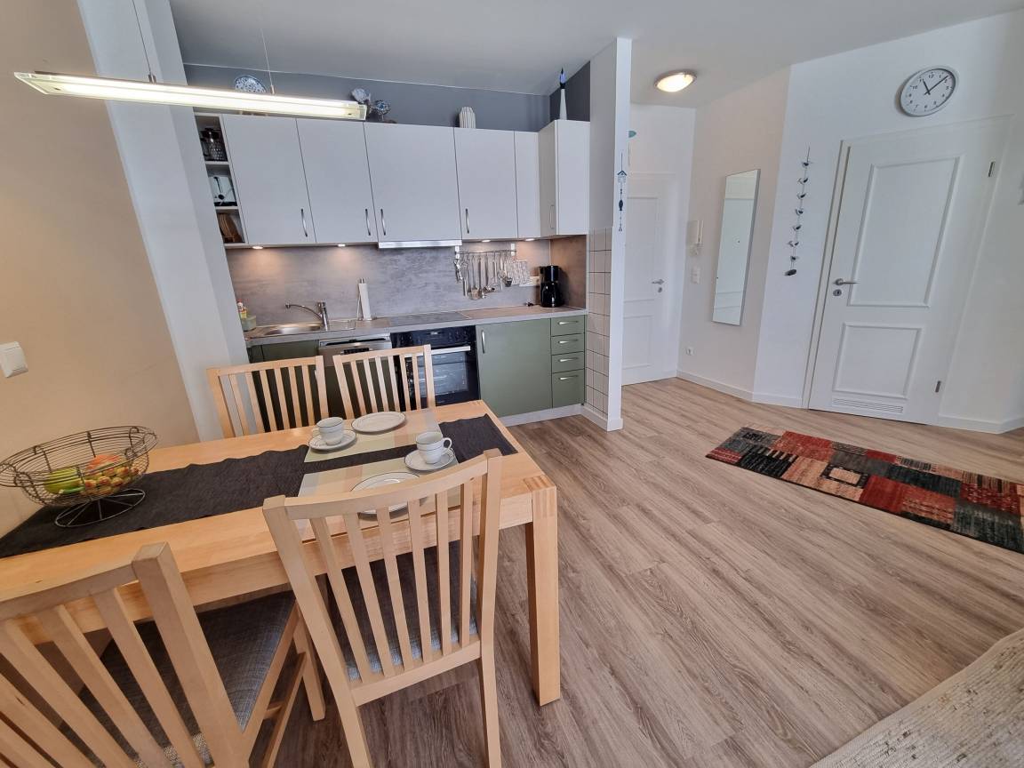 Im Wohnbereich ist eine Schlafcouch für 2 Personen, ein Esstisch sowie eine Pantryküche mit 4-Platten-Ceranfkochfeld, Backofen und Geschirrspüler. Der