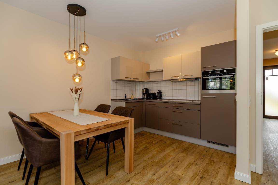 Die offene Küche grenzt direkt an den Wohnbereich. Die Küche ist voll ausgestattet, vom Besteck über Geschirr bis hin zu diversen Küchenutensilien. Natürlich ist auch eine Kaffeemaschine, ein Toaster, Wasserkocher, Cerankochfeld, Backofen, Kühlschrank und Geschirrspüler vorhanden.