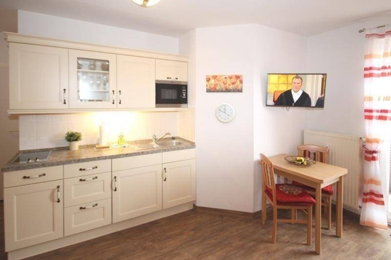 Angrenzend befindet sich die neue moderne und voll ausgestattete Küche. Hier können sie schnell und problemlos Ihre Lieblingsmahlzeit zaubern, die Sie am kleinen Esstisch mit zwei Stühlen gemeinsam einnehmen können.