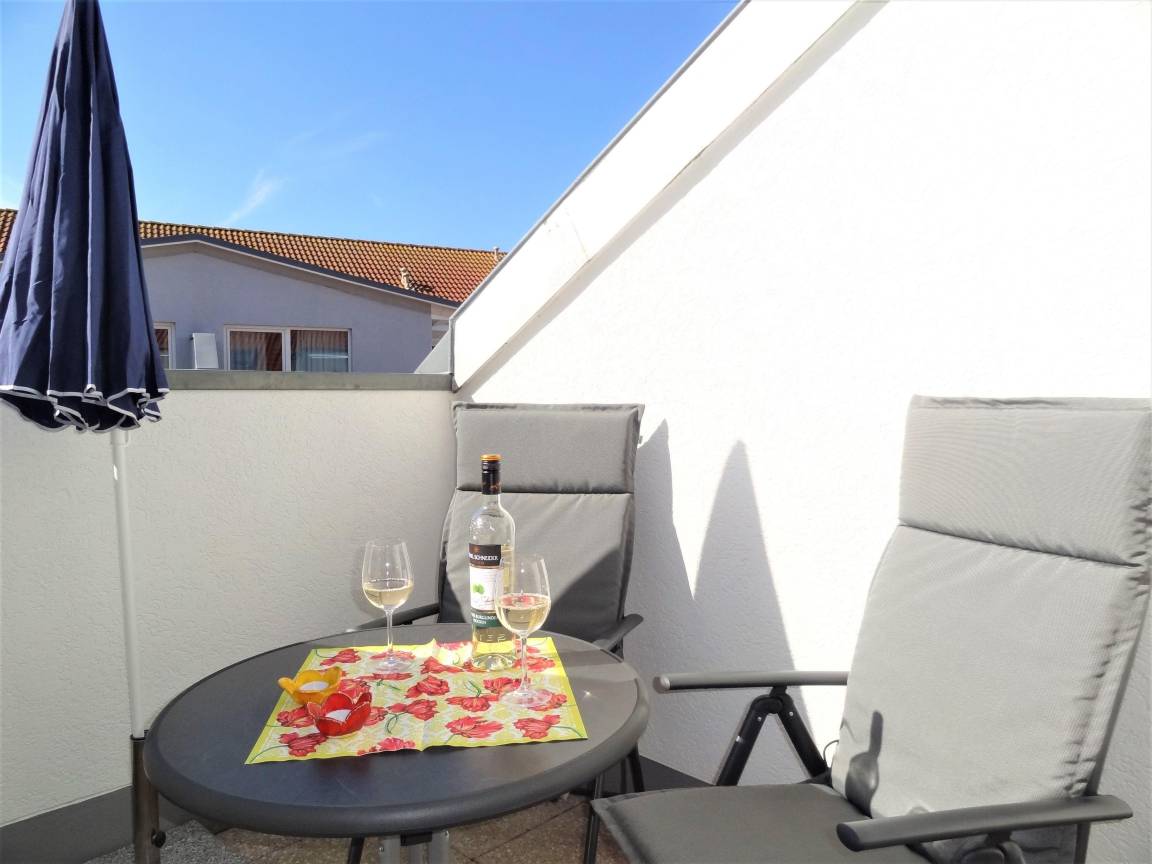An Ihre Wohnung grenzt eine windgeschützte Loggia, die zur Südseite ausgerichtet ist und die Sie direkt von Ihrem Wohnzimmer aus betreten können. Die Loggia ist mit einem Tisch, 2 Stühlen und einem Sonnenschirm ausgestattet, hier können Sie ein wenig Sonne tanken und die Seele baumeln lassen. Bei einem leckeren Getränk einen ereignisreichen Tag gemeinsam ausklingen lassen.....Urlaubs-Feeling pur!