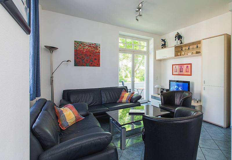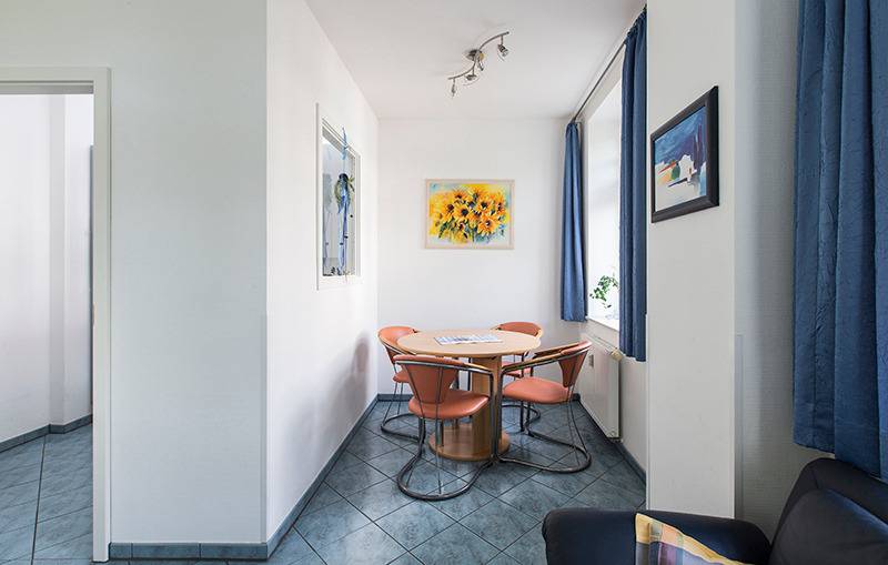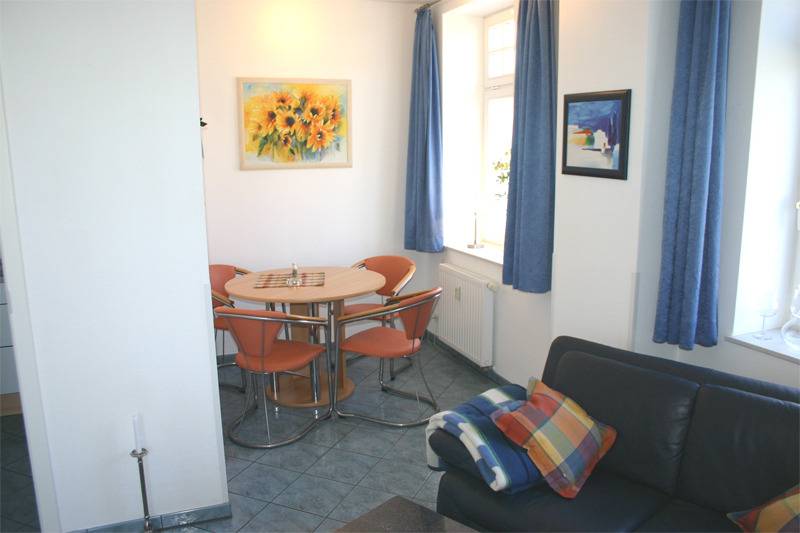 Sie ist hell und freundlich möbliert mit einem Wohnbereich mit Sitzgruppe, Flachbild-TV sowie einem Esstisch.