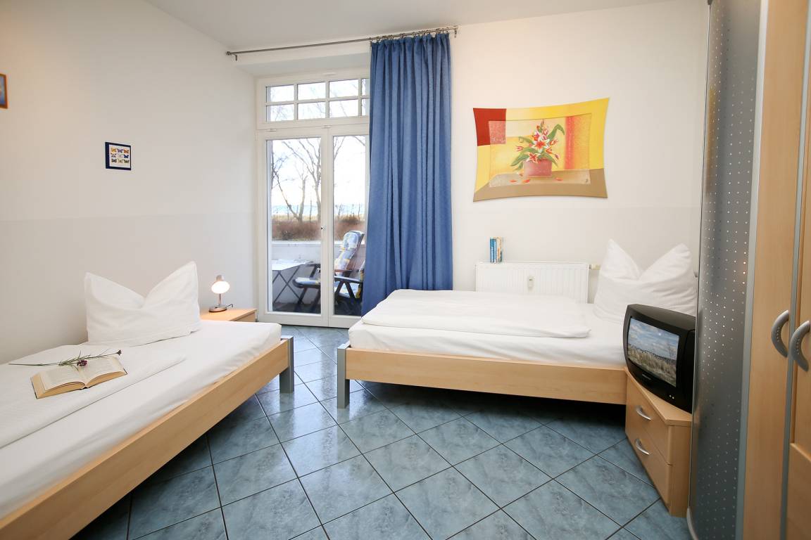 Einzelbetten mit einem Flachbild-TV Gerät. Das Duschbad/WC sowie ein separates Gäste-WC ergänzen die Wohnung.