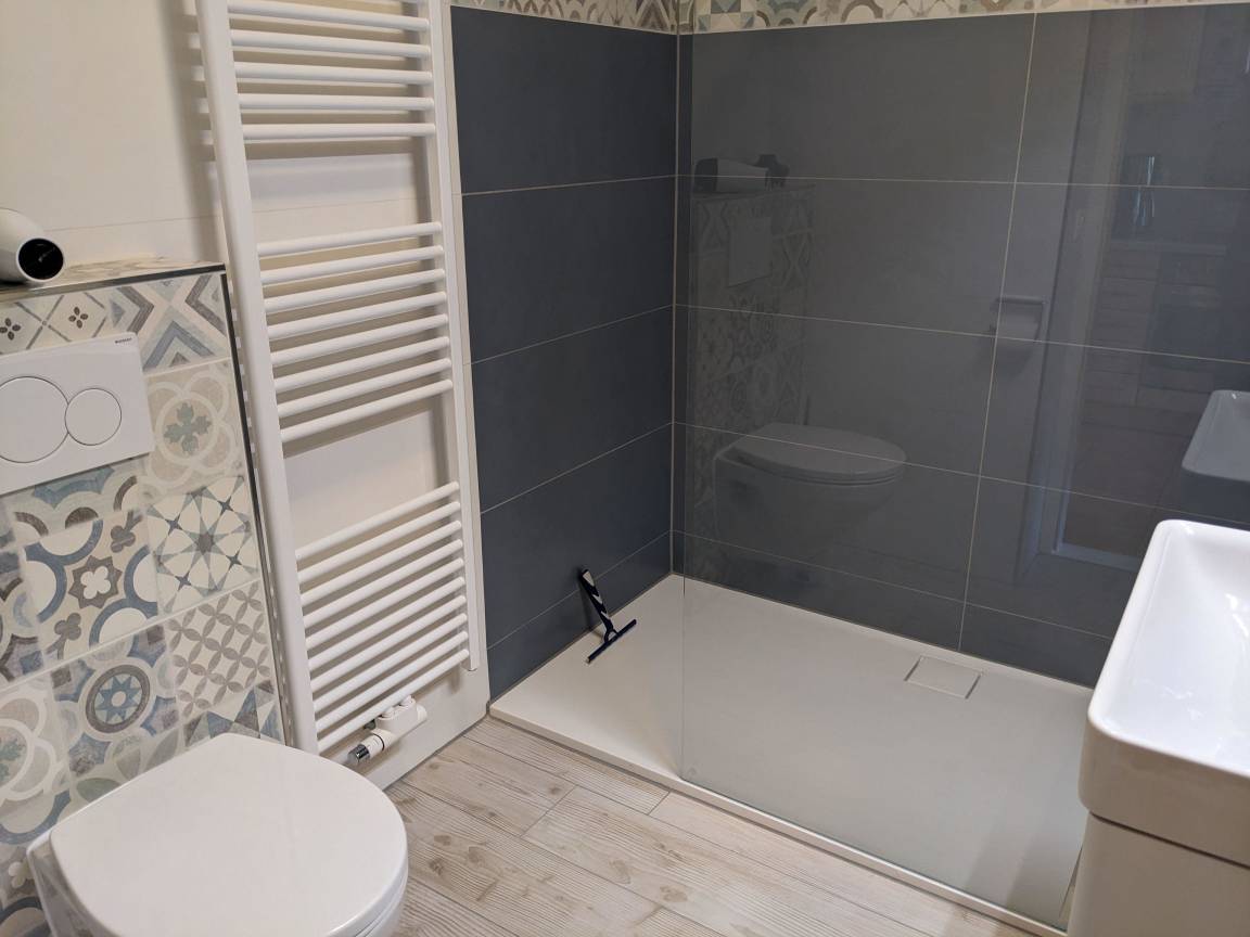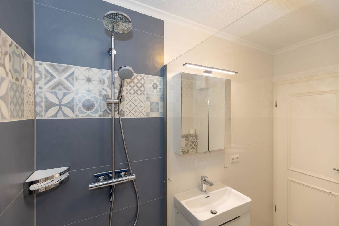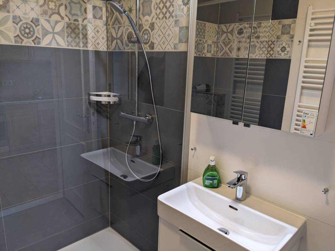 Das komplett geflieste Badezimmer verfügt über eine Dusche, ein WC, ein Waschbecken mit Unterschrank für Ihre Badutensilien sowie einen Handtuchheizkörper. Auch ein Föhn ist vorhanden.