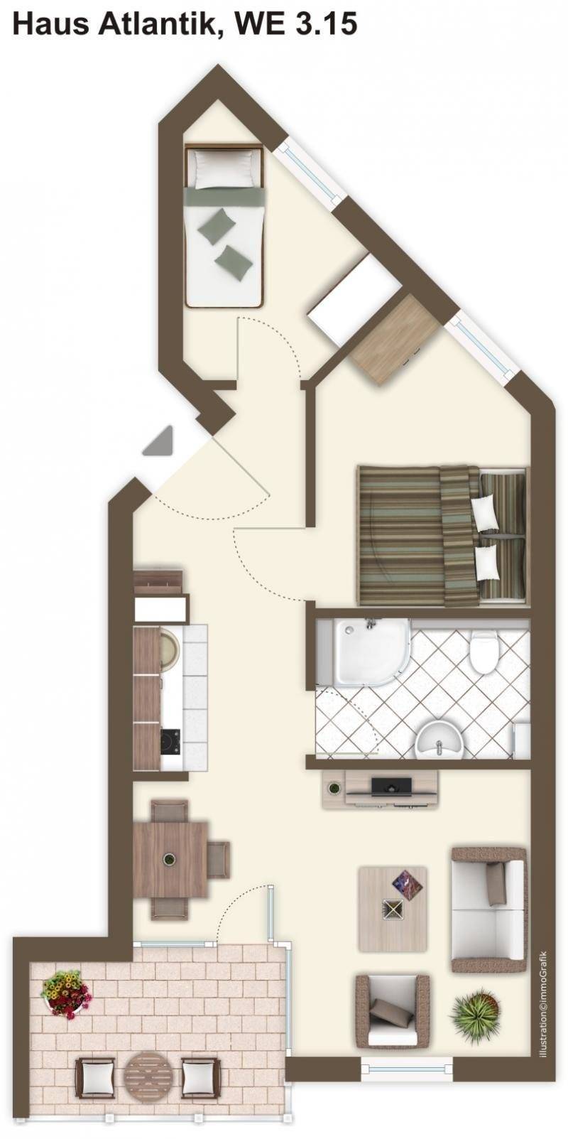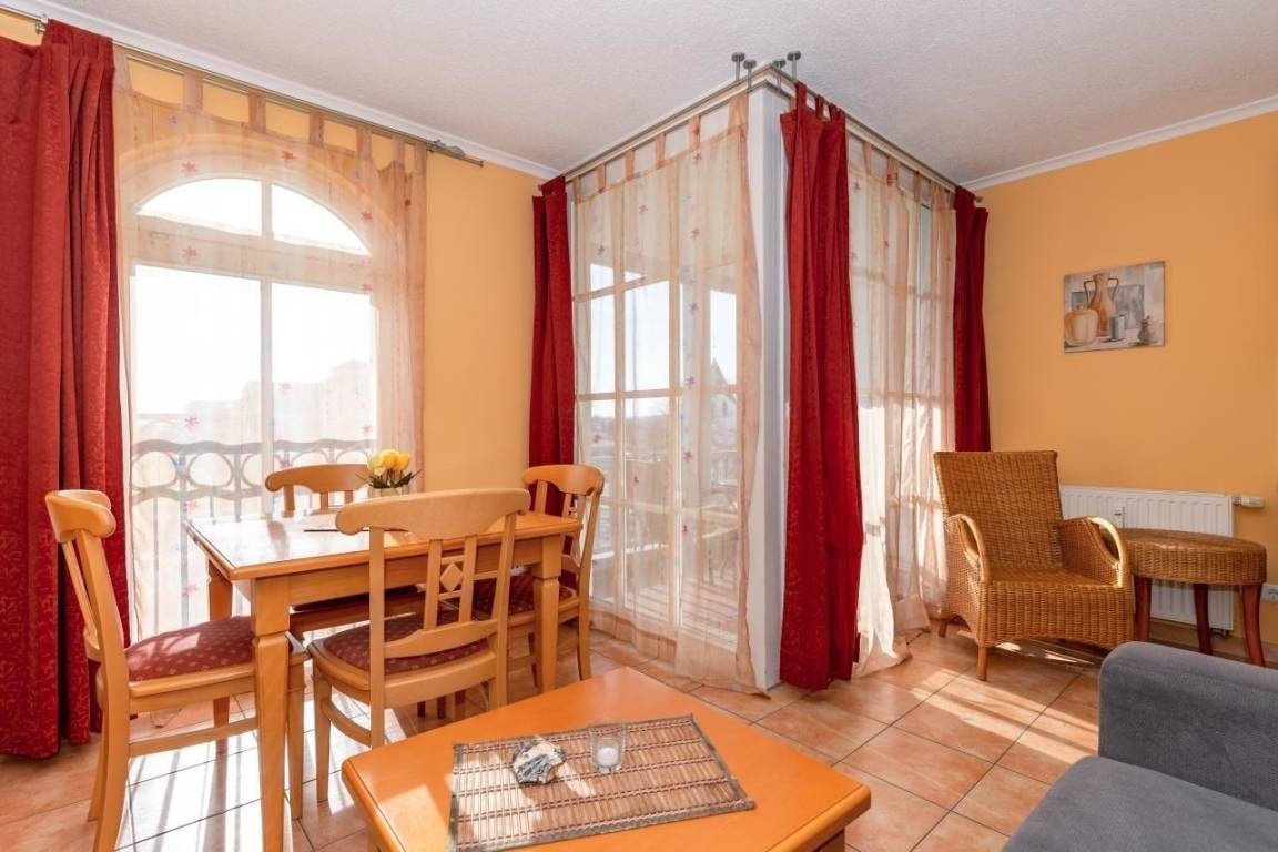 Das stilvolle Apartment befindet sich im 3. Obergeschoss mit Ausrichtung nach Osten. Ein Aufzug bringt Sie bequem in Ihr Apartment. Auf 45 m² erleben hier bis zu 4 Personen in unserer schönen 3-Zimmer-Ferienwohnung einen traumhaften Urlaub in bester Lage.