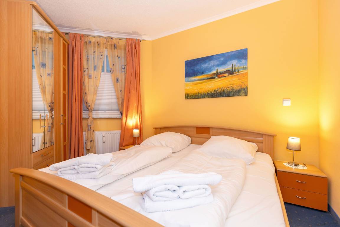 Im großzügigen Schlafzimmer stehen Ihnen ein komfortables Doppelbett und ein geräumiger Kleiderschrank für Ihre Urlaubsgarderobe zur Verfügung.