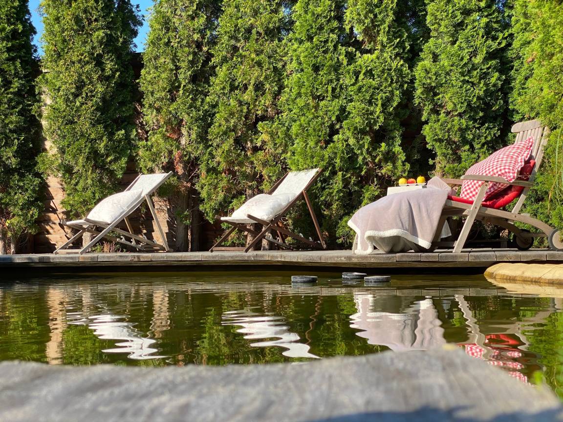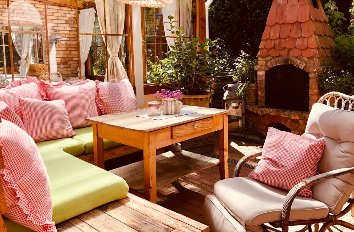 Im Herzstück unseres Gartens - zwischen Apfelbäumen und Hortensien eingebettet liegt der "Apfeltraum". Zwei Licht-durchflutete Sonnenterrassen laden zum Frühstück, Grillen oder zum Lesen ein.
