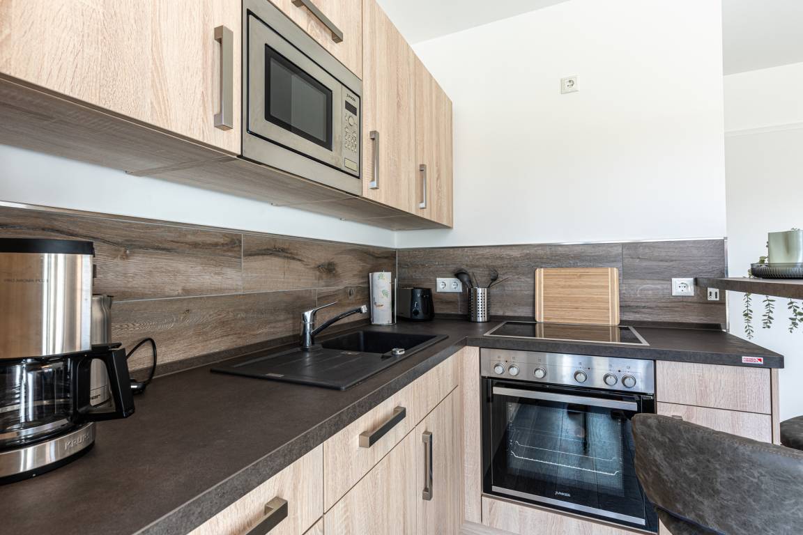 An den Wohnbereich schließt sich die komplett eingerichtete, hochwertige Küche an: Nebst 4-Platten-Cerankochfeld mit Backofen und Mikrowelle, stehen Ihnen außerdem Toaster, Wasserkocher, Kaffeemaschine, Geschirrspüler und Kühlschrank mit Gefrierfach zur vollen Verfügung!