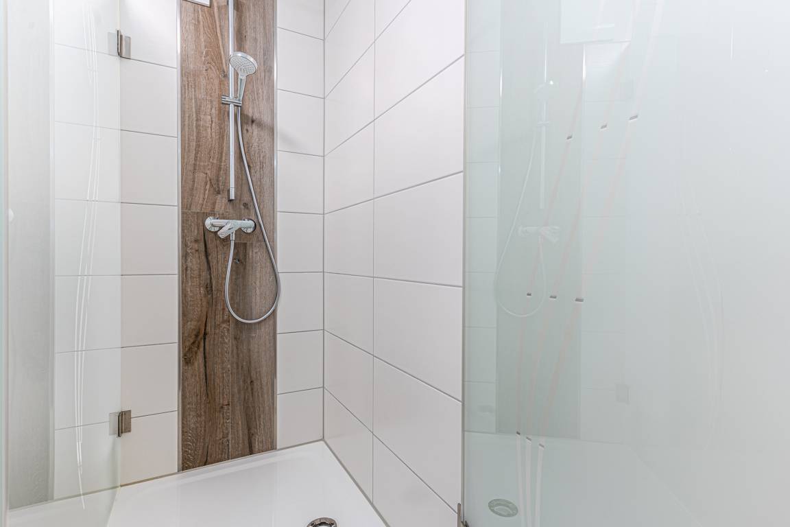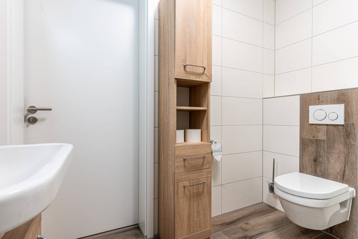 Das Badezimmer verfügt über eine ebenerdige Dusche, WC sowie einem schönen Waschtisch mit beleuchteten Spiegel.
