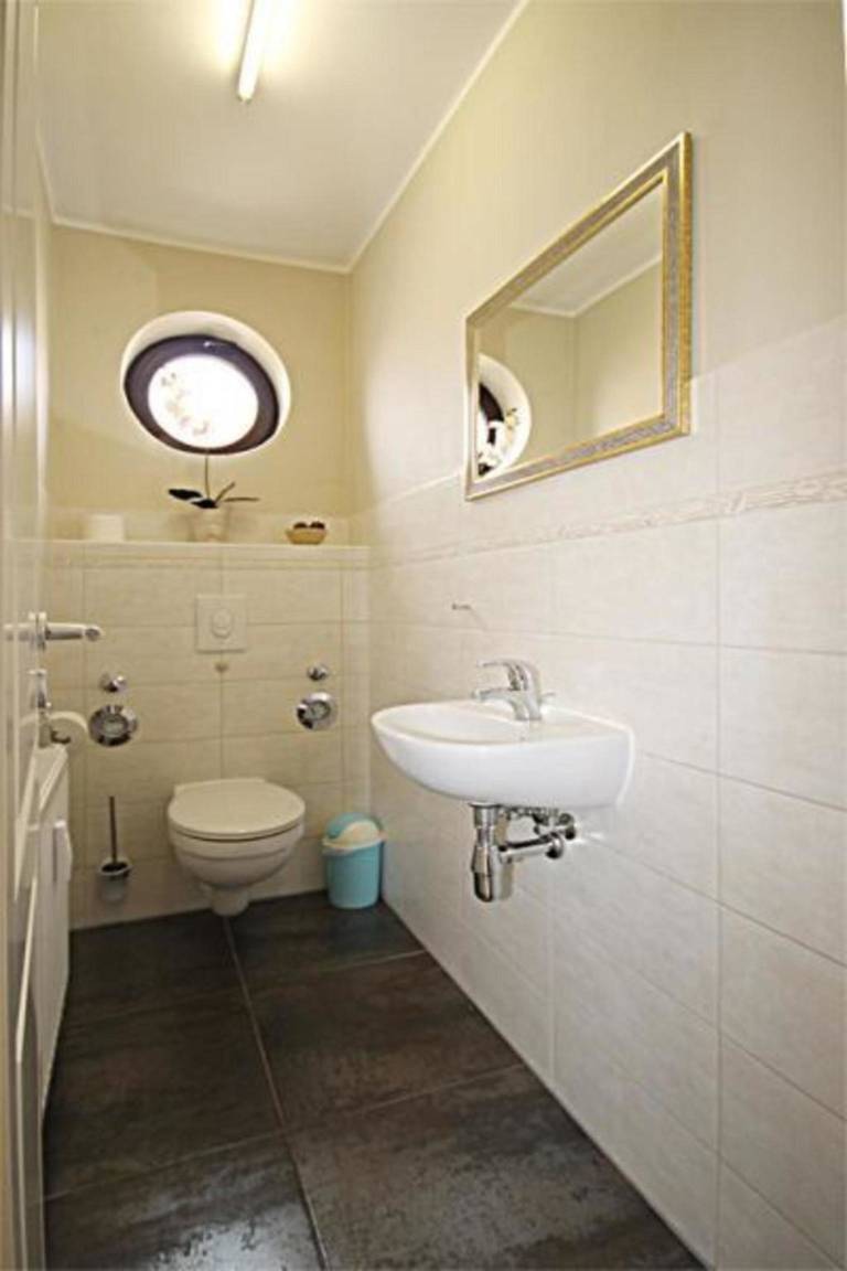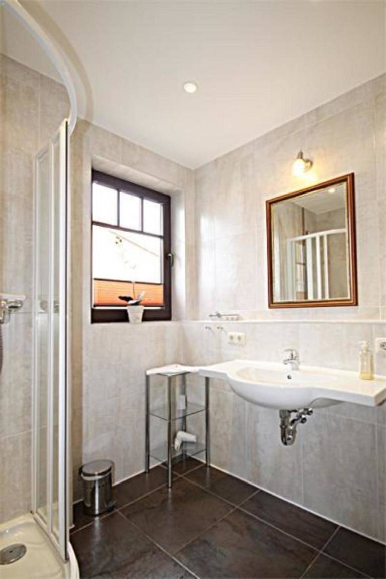 Das Badezimmer ist mit einer Dusche und einem Waschbecken ausgestattet, das WC befindet sich separat in einem weiteren Raum und verfügt ebenfalls über ein Waschbecken.
