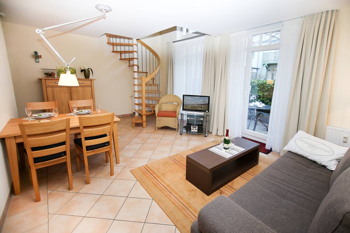 Im Erdgeschoss befindet sich das Wohnzimmer mit Flachbild-TV und Stereoanlage sowie die offene Küchenzeile und ein Gäste-WC. Vom Wohnzimmer aus geht es auf die Terrasse.