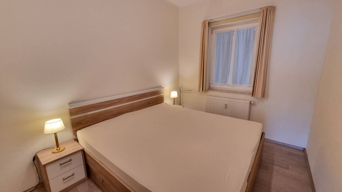 Das Schlafzimmer ist mit einem Doppelbett ausgestattet. Die Ferienwohnung verfügt außerdem über ein Duschbad und eine Toilette.