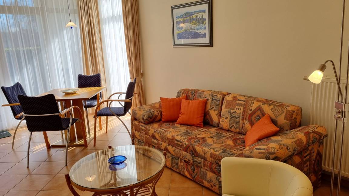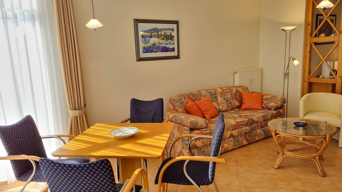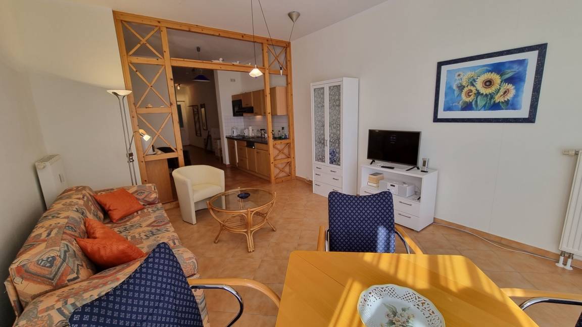 Das Appartement befindet sich im Erdgeschoss des Hauses und verfügt über einen Wohnbereich mit offener Küchenzeile, einer Schlafcouch, einem Fernseher und einem Esstisch.