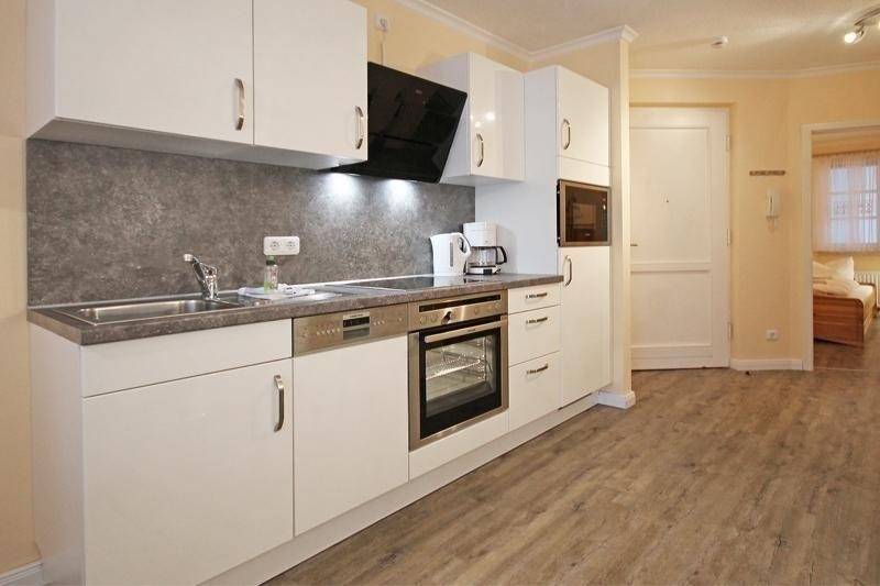 Sie verfügt über eine komplett ausgestattete Küchenzeile mit Mikrowelle, Glaskeramik-Kochfläche, Backofen, Spülmaschine, Toaster, Wasserkocher und einer Kaffeemaschine. Auch ausreichend Besteck und Geschirr sowie weitere Küchenutensilien sind vorhanden.