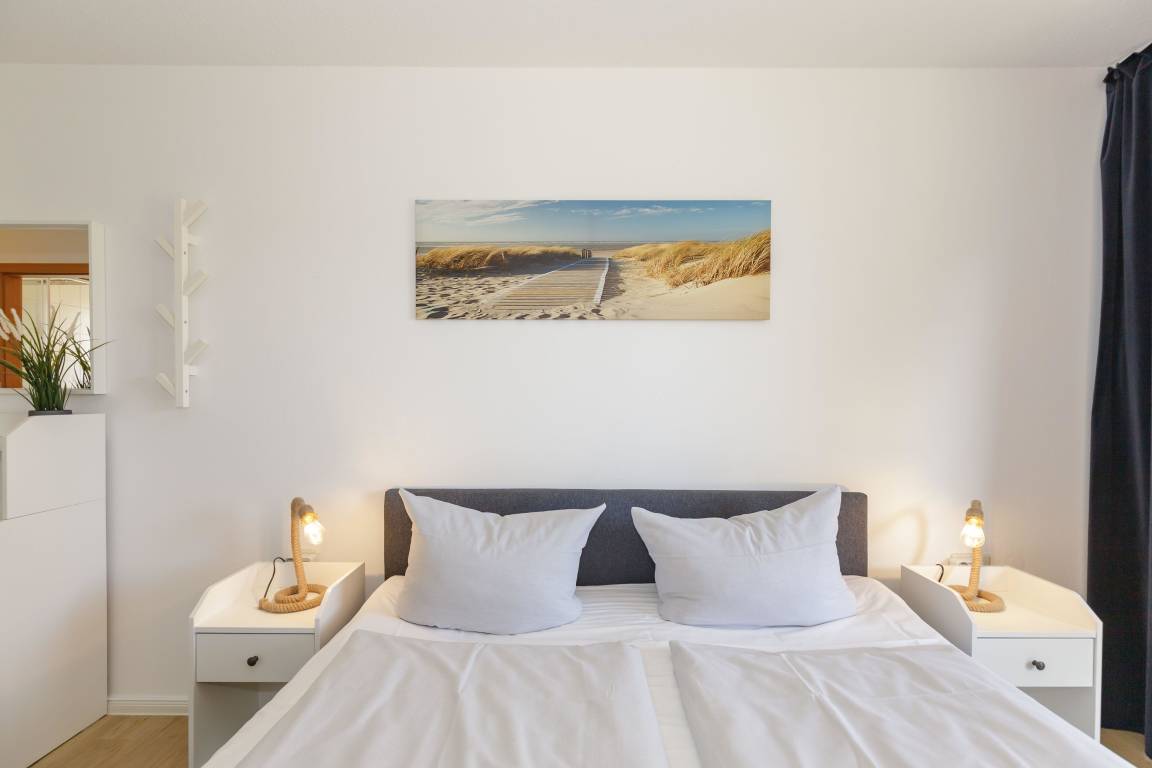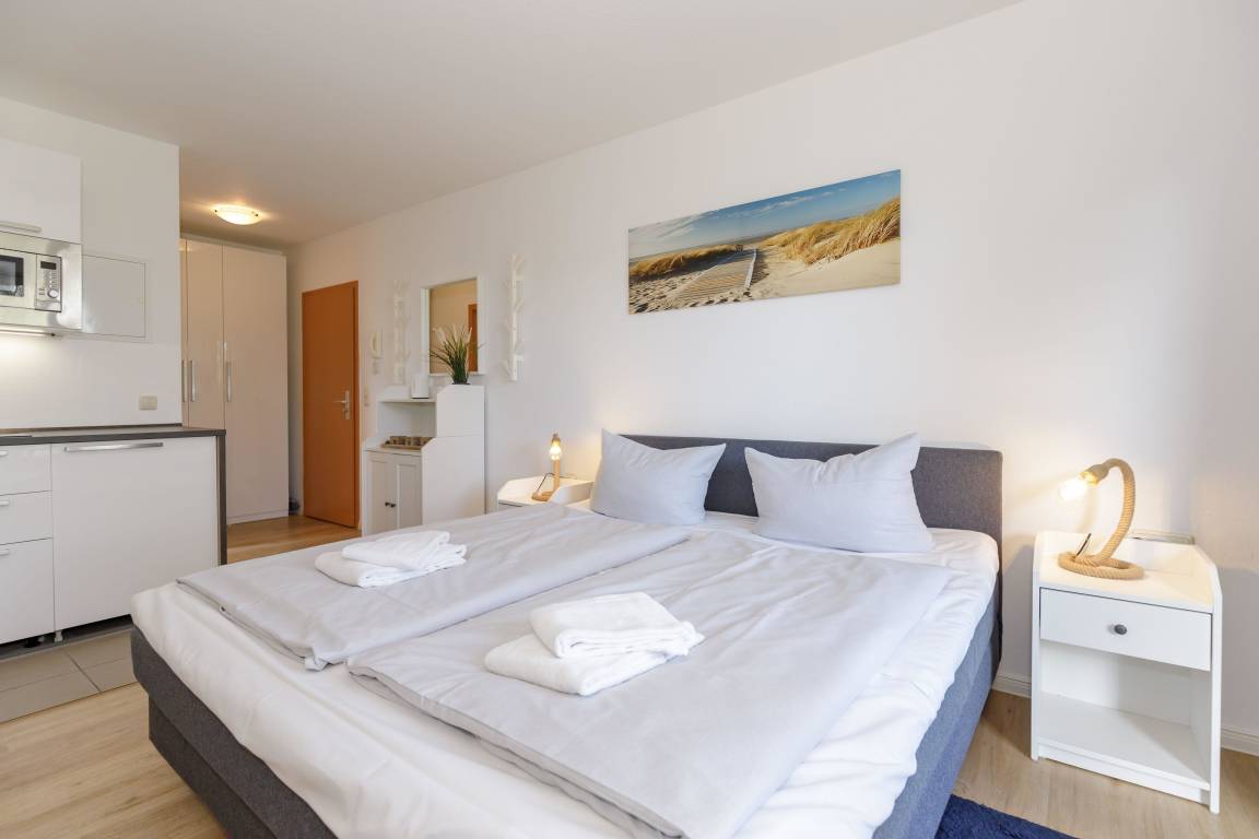Das Doppelbett, ein geräumiger Kleiderschrank und zwei Nachtschränken komplettieren den kombinierten Wohn- / Schlafbereich.
