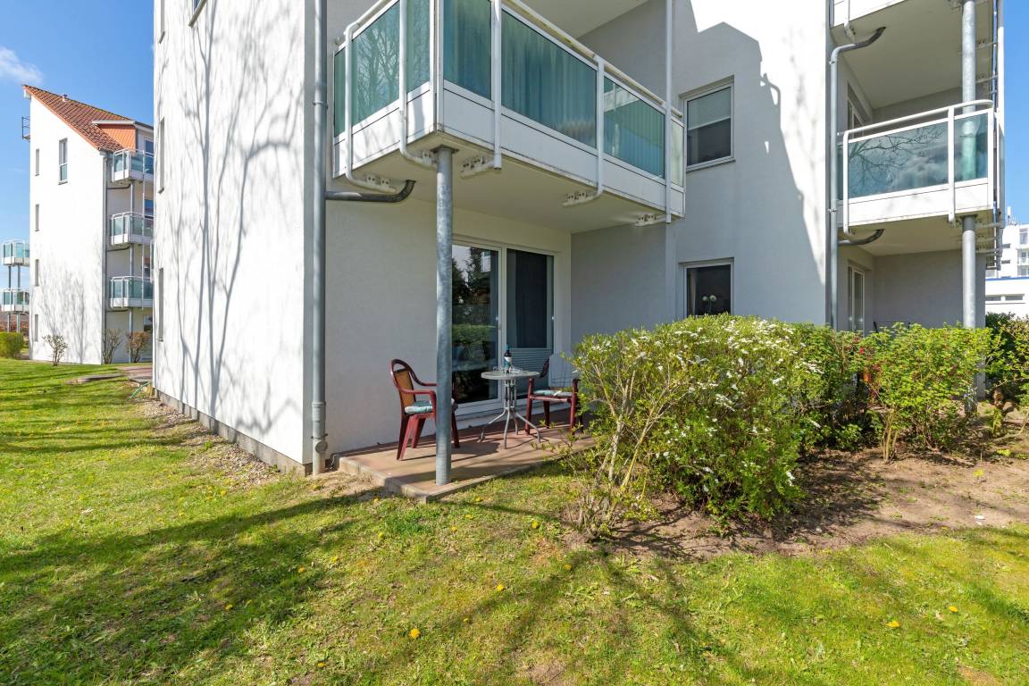 Die Ferienwohnung verfügt über eine Terrasse, welche nahezu uneinsehbar ist und zur Rückseite des Hauses in Richtung Ostsee belegen ist. Diese ist mit Tisch und Stühlen möbliert und lädt zum entspannten Verweilen im Freien ein.
