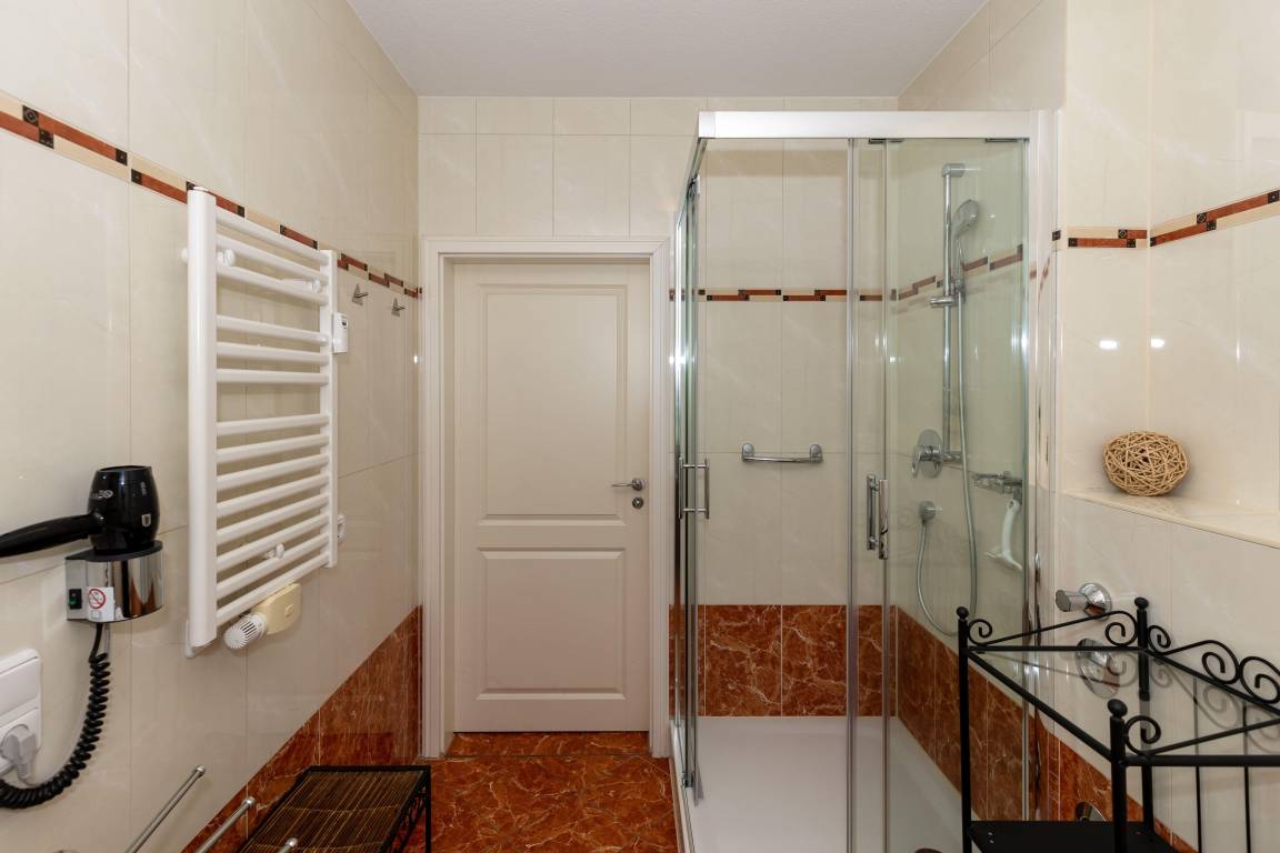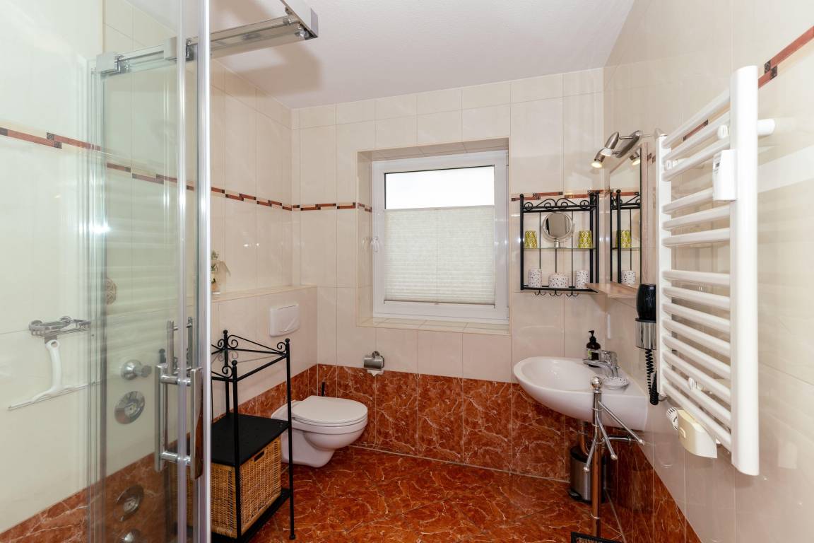 Das voll geflieste Bad im mediterranen Stil verfügt über eine komfortable Dusche und sorgt mit Handtuchwärmer und Fußbodenheizung auch bei kühleren Tagen für einen angenehmen Start in den Tag.