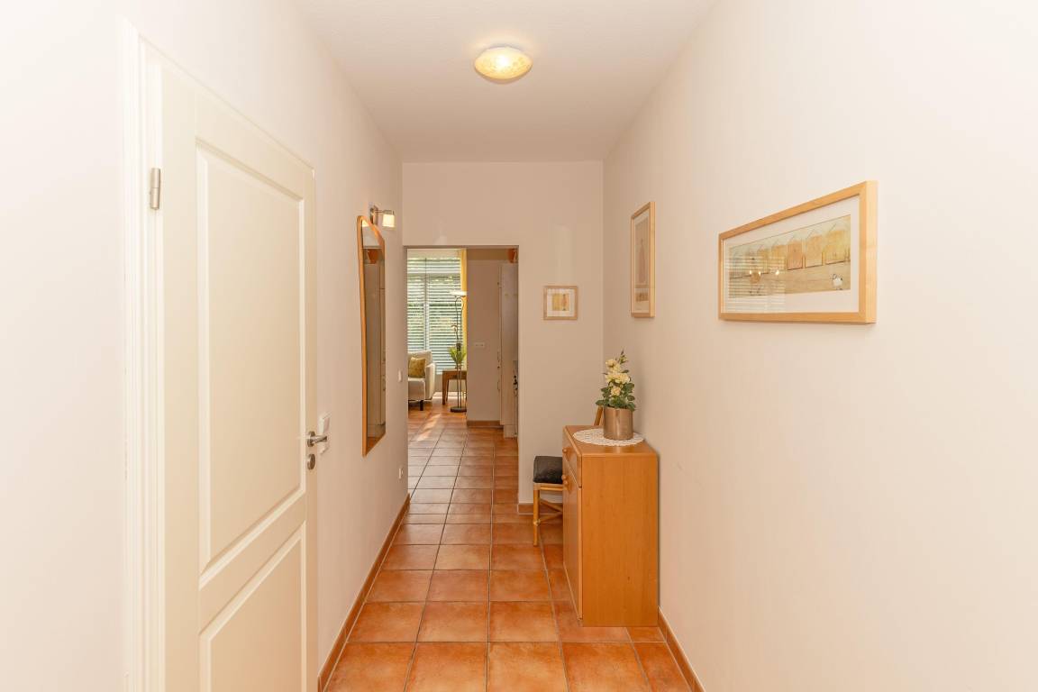 Ein breiter Eingangsbereich verbindet die Zimmer und bietet Ablage für Garderobe und Schuhwerk.